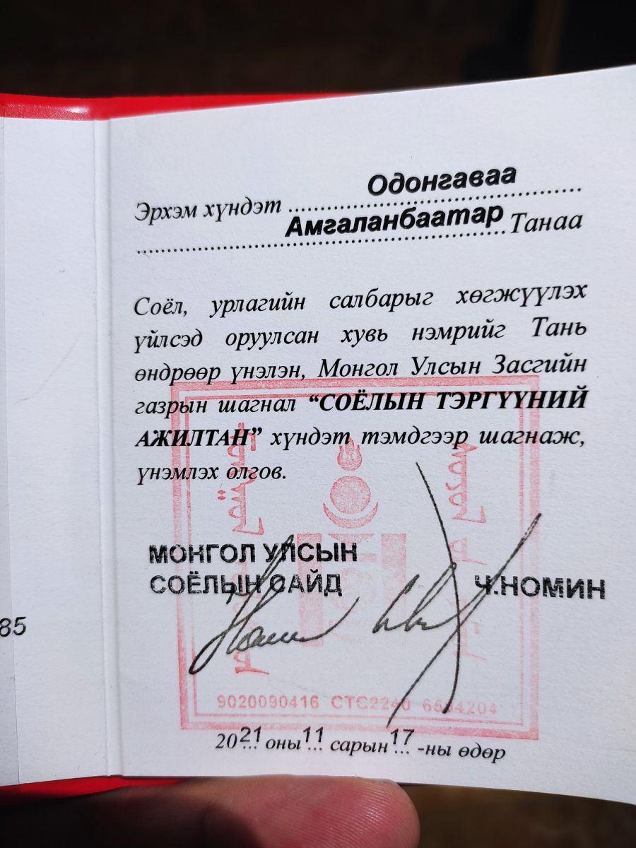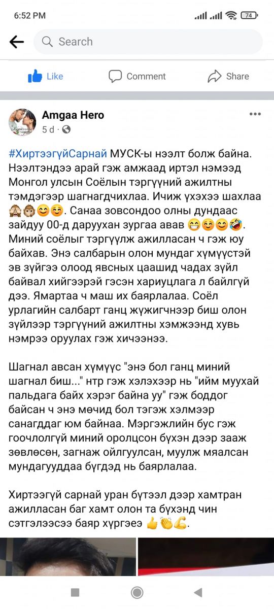 Би "Хиртээгүй сарнай" кино нээлтэн дээр гэнэт МУСТА тэмдэгээр шагнуулаад сандарч гайхах, санаа зовохдоо "өөрөөсөө ичиж үхэхээ шахлаа" гэсэн пост оруулсан юм. Тэгсэн өнөөдөр өнөөх тэмдэгийг нь өгдөг соёлын яамнаас нь надруу залгалаа. "Дэд сайд өөрийн чинь постыг харсан байнаа. Ичиж байгаа бол эргүүлээд авчихаж болно" гэсэн утгатай үгийг их тийм дээрээс эвгүй өнгөөр хэлж байнаа. Яам тамганыхан гэхээрээ л ярвайлттай, дээрэнгүй өнгөөр дээрэлхэж харьцдаг байх ёстой юм уу? Эгдүү дургүй зэрэг хүрээд тасалчихлаа. Олон хүмүүс постыг маань ойлгоод баяр хүргээд л байсан юм. Уул нь ухаантай битгий хэл уншиж бичдэг хүнд маш тодорхой ойлгогдохоор "би соёл урлагийг тэргүүлж ажиллаж чадаагүй ээ, энэ шагналыг авахаасаа ӨӨРӨӨСӨӨ ичиж байнаа. Гэхдээ цаашид юм хий гэсэн санаа байхаа хичээнээ, баярлалаа" гэсэн л утга илэрхийлсэн төдий. Юу ч хэлэхэв дээ. Харам олддог тэмдэгийг нь авчихаад хайхрамжгүй үг хэлчихсэн бололтой. Бурхны хөшөө нтр барих гээд завгүй байдаг яамныхандаа буцаагаад өөрөө аваачаад өгчихнөө. Өөрөөсөө тэмдэг авахдаа ичиж байсан бол өнөөдөр та нараас бүр их иччихлээ