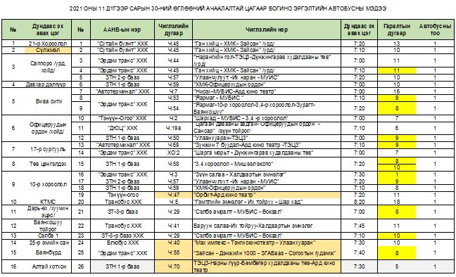 Нийтийн тээврийн үйлчилгээний газраас уртасгасан цагийн автобус үйлчилгээнд явуулаад багагүй хугацаа өнгөрч байна. Мөн ачаалал ихтэй замуудад түгжрэл үүсдэг оргил цагуудаар богино эргэлтийн автобусны үйлчилгээг нэвтрүүлжээ.