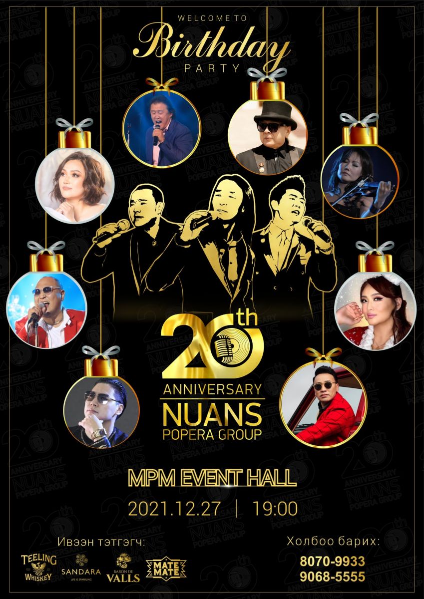 НЮАНС хамтлаг 20 жил шинэ жилийн баяраа 2021 оны 12 сарын 27 (Даваа гариг) 19.00 цагаас " MPM EVENT HALL”- д зохион байгуулах гэж байна. Мэдээж МУАЖ Чингис хаан хамтлагийн ахлагч Д.Жаргалсайхан, МУГЖ Ц.Чулуунбат /Харанга хамтлаг/, МУГЖ Поп дива Б.Сарантуяа, МУГЖ Ө.Уянга /ДБЭТ/, Алтангадас одонт Т.Дэлгэрмөрөн /Номинталст хамтлаг/, Хийлч Дээгий, Жааз дуучин Наагий, Поп дива Сэрчмаа, Эрч хүчийг мэдрүүлэх Нарандэлгэр BitBox Ray, Moondance, Улаансарнай, Эрхэмсэг, 2022 оны шилдэг үзүүлбэрт Mongolian entertainment хамтлагууд уригдан Нюанс хамтлагийн төрсөн өдөрт мэндчилгээ дэвшүүлэх аж.