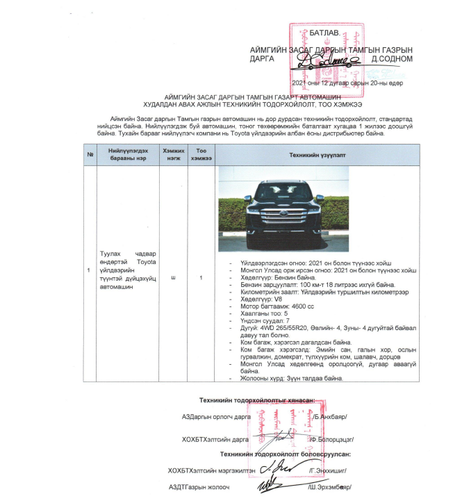 Тухайлбал, 2021 оны 12 сарын 23-ны өдөр Говьсүмбэр аймгийн Засаг даргын тамгын газар орон нутгийн төсвөөс 300 сая төгрөгийн үнэ бүхий автомашиныг худалдан авах тендер зарлажээ. Уг тендерийг 2022 оны 1 сарын 04-ны 08:30 минутаас өмнө авахаар тооцоолжээ.