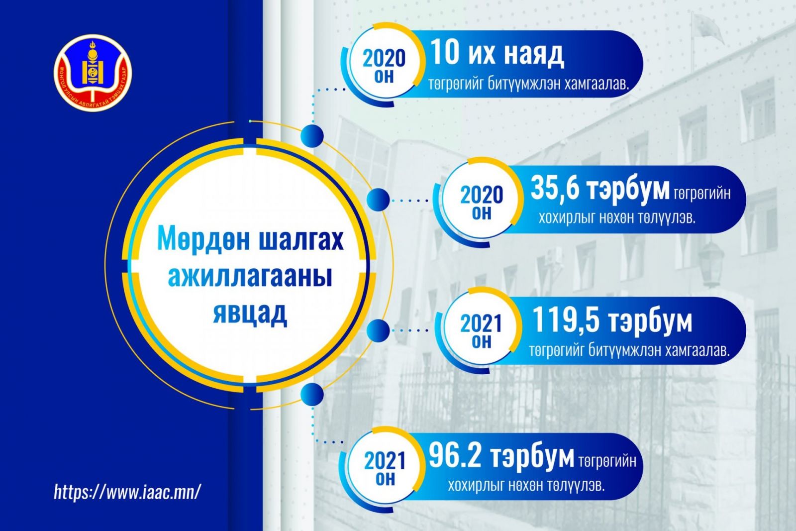 АТГ-ын мөдөн шалгах ажиллагааны хүрээнд 2020 онд 10 их наяд төгрөгийг битүүмжлэн 35.6 тэрбум төгрөгийн хохиролыг нөхөн төлүүлж байсан бол 2021 онд 119,5 тэрбум төгрөгийг битүүмжлэн хамгаалж, 96.2 тэрбум төгрөгийн хохиролыг нөхөн төлүүлжээ.