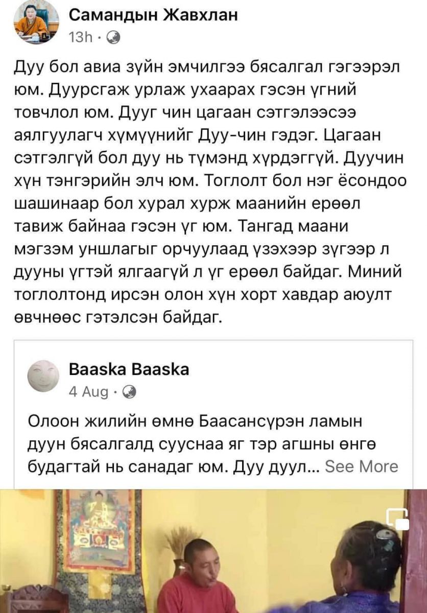 “Дуу бол авиа зүйн эмчилгээ бясалгал гэгээрэл юм. Дуурсаж урлаж ухаарах гэсэн үгний товчлол юм.Дууг чин цагаан сэтгэлээсээ аялгуулагч хүмүүнийг Дуу-чин гэдэг. Цагаан сэтгэлгүй бол дуу нь түмэнд хүрдэггүй. Дуучин хүн тэнгэрийн элч юм. Тоглолт бол нэг ёсондоо шашнаар бол хурал хурж маанийн ерөөл тавьж байна гэсэн үг юм. Тангад маани мэгзэм уншлагыг орчуулаад үзэхээр зүгээр л дууны үгтэй ялгаагүй л үг ерөөл байдаг. Миний тоглолтод ирсэн олон хүн хорт хавдар аюулт өвчнөөс гэтэлсэн байдаг” хэмээн нийтэлжээ.