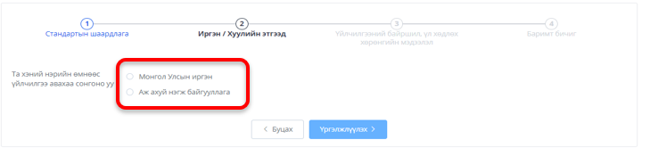 Холбогдох баримт бичгийн мэдээллийг оруулж “Үргэлжлүүлэх” товчийг дарна. Мөн бүрдэл баримт бичгийг өмнө авч байсан эсэх мэдээллийг оруулснаар холбогдох байгууллагуудын албан хаагчид тантай ажлын үйлчилгээ эрхлэх явцад ажлын тав хоногийн дотор холбогдоно.