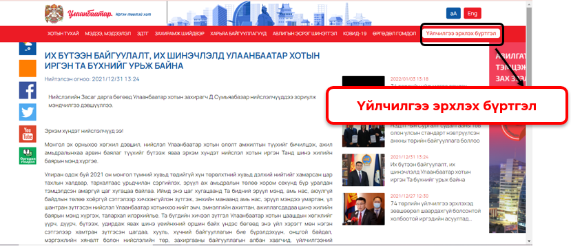 Нийслэлийн мэдээ мэдээллийн нэгдсэн www.ulaanbaatar.mn портал сайтаар нэвтэрч, “Үйлчилгээ эрхлэх бүртгэл” цэсийг сонгон онлайн бизнес төвийн системд нэвтэрнэ.