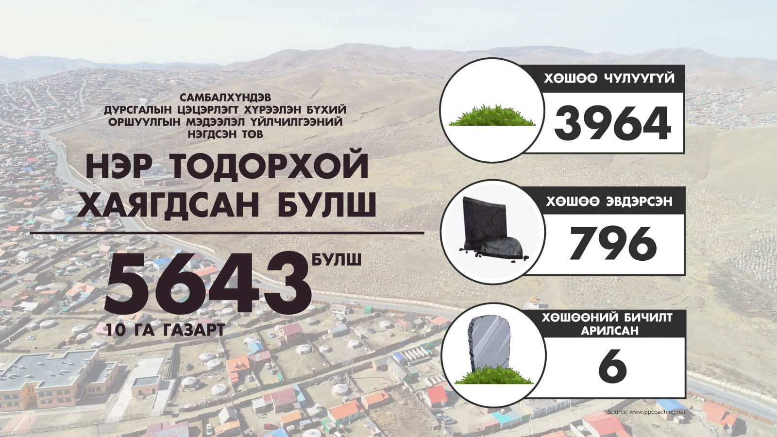 Харин нэр тодорхойгүй хаягдсан 5643 булшны 3964 нь хөшөө чулуугүй, 796 булшны хөшөө эвдэрсэн, зургаан булш хөшөөний бичилт арилсан байдалтай байгааг тогтоожээ. Хэрэв цэцэрлэгт хүрээлэн байгуулахаар төлөвлөгдсөн хэсэгт ойр, дотнын хүнээ оршуулсан бол 7210-0101 лавлах дугаар, www.sambalkhundev.mn сайтад хандан төслийн талаар дэлгэрэнгүй мэдээллийг авах боломжтой. Мөн чөлөөлөлтийн талбайд орсон нэр тодорхой шарилын талаарх мэдээллийг хайлтын хэсгээс шүүх боломжтой юм.