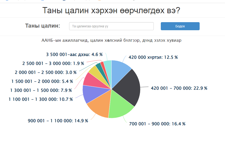 Иймд Монгол улсын хэмжээнд 22,9% болох 420,001-700,000 төгрөгийн цалинтай иргэд дийлэнх хувийг эзлээд байна.