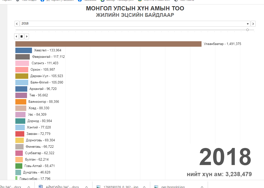Монгол улсын хүн амын тоо 2018 оны байдлаар 3.238.479 гэсэн сүүлийн мэдээлэл байдаг. Тодруулбал, Нийслэл Улаанбаатар хотод 1.491.375 хүн ам байдаг бол хөдөө орон нутагт 1.747.104 хүн ам оршиж байна.