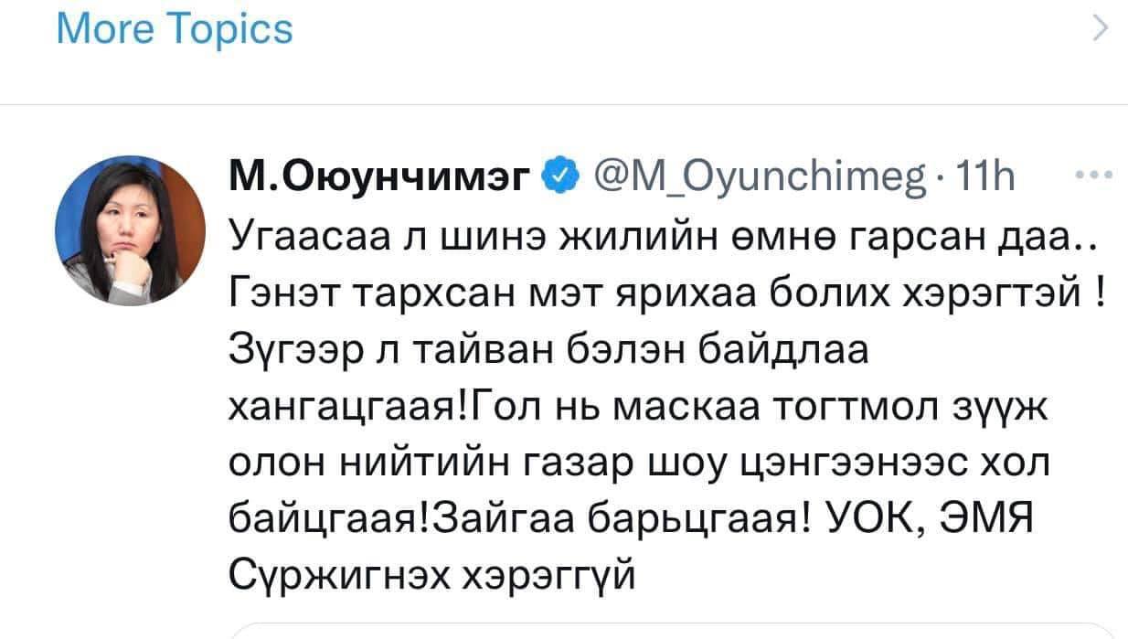 “Угаасаа л шинэ жилийн өмнө гарсан даа. Гэнэт тархсан мэт ярихаа болих хэрэгтэй. Тайван бэлэн байдлаа хангацгаая. Гол нь амны хаалтаа зүүж олон нийтийн газар шоу цэнгээнээс хол байцгаая. УОК, ЭМЯ сүржигнэх хэрэггүй” гэжээ.