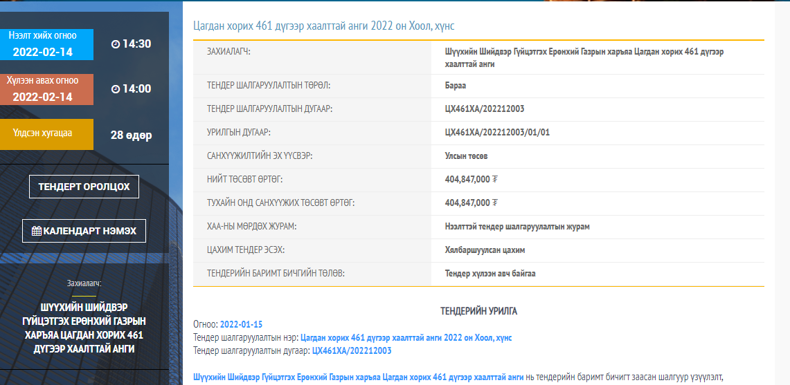 Тодруулбал, 2022 оны 1-р сарын 15-ны өдөр Цагдан хорих 461 дүгээр хаалттай анги 2022 оны хоол хүнсэнд 404,847,000 сая төгрөгийн бараа нийлүүлэх тендер зарласан байна. Уг тендерийг 2022 оны 02 -р сарын 14 -ны өдрийн 14 цаг 00 минутад хүлээж авахаар тооцоолсон байна.