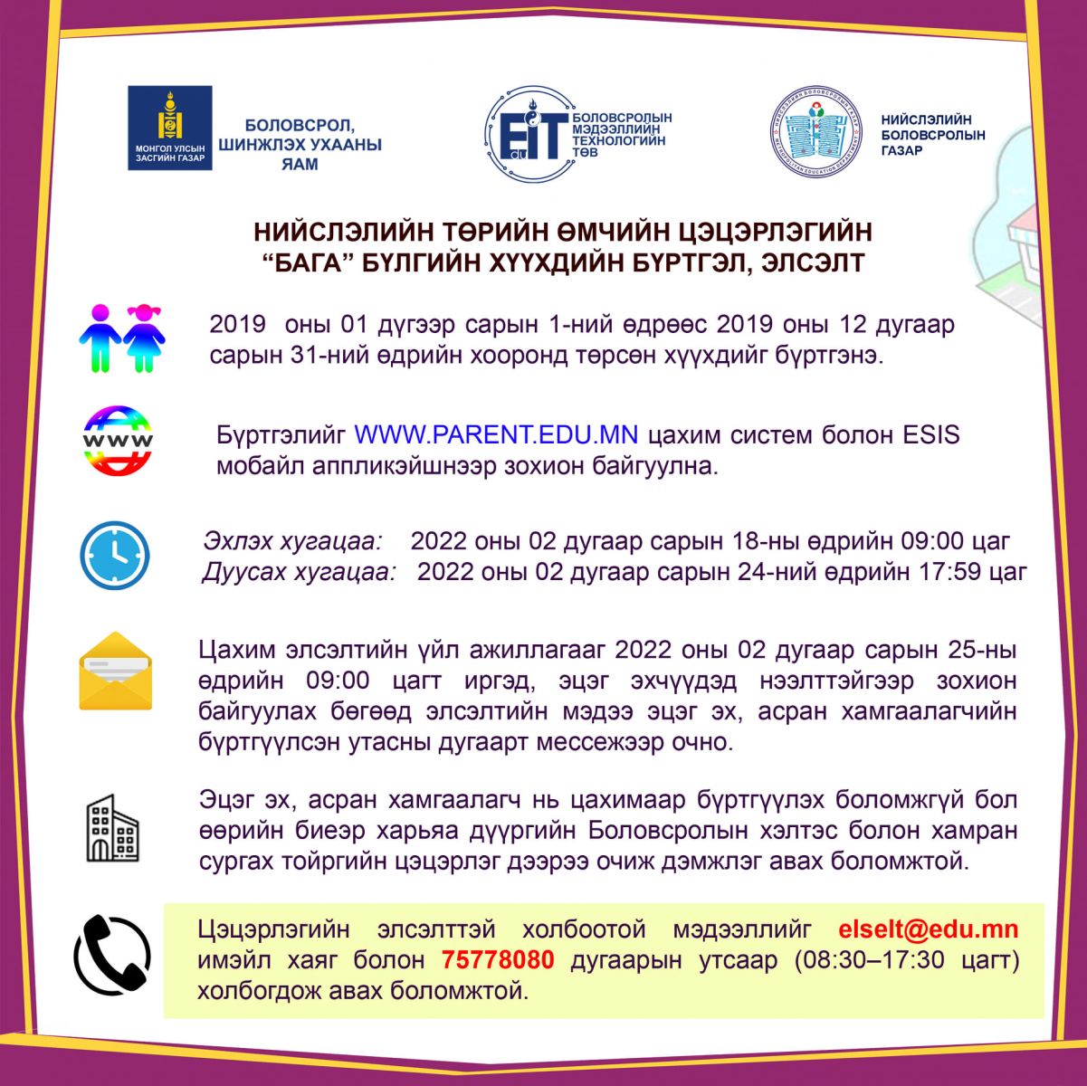 Цэцэрлэгийн элсэлттэй холбоотой мэдээллийг elselt@edu.mn имэйл хаяг болон 75778080 дугаарын утсаар /08:30-17:30 цагт/ холбогдож авах боломжтой юм.