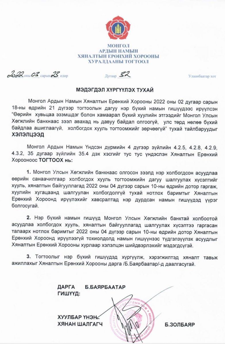 2022.03.23-ны өдөр Монгол Ардын Намын Хяналтын ерөнхий хороо уг асуудлаар дахин хуралдаж, ирүүлсэн тайлбар нэг бүрийг авч хэлэлцээд, Намын дүрмийн 4 дүгээр зүйлийн 4.2.5, 4.2.8, 4.2.9, 4.3.2, 35 дугаар зүйлийн 35.4 дэх хэсгийг тус тус үндэслэн, “Мэдэгдэл хүргүүлэх тухай” 32 тоот тогтоол гаргасан.