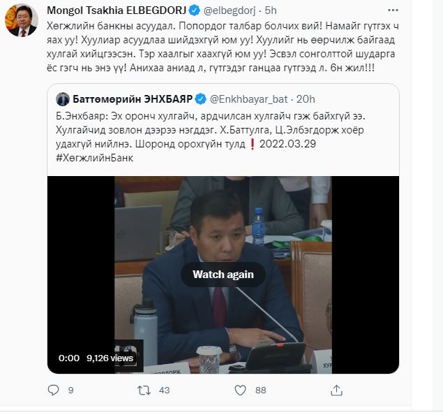 Монгол улсын экс ерөнхийлөгч Ц.Элбэгдорж Хөгжлийн банкны хэрэгт "Хөгжлийн банкны асуудал попордог талбар болчих вий" хэмээн байр сууриа илэрхийллээ. Өчигдөр болсон нээлттэй сонсголын үеэр АСЕМ-д зарцуулсан хөрөнгө, санхүүжилтийг ил болгож, шалгах ёстой гэсэн асуудал хөндөгдсөн. Тэгвэл тэрээр твиттер хуудаснаа "Намайг гүтгэх ч яахав. Хуулиар асуудлаа шийдэхгүй юм уу. Хуулийг нь өөрчилж байгаад хулгай хийцгээсэн. Тэр хаалгыг хаахгүй юм уу. Эсвэл сонголттой шударга ёс гэгч нь энэ үү. Анихаа аниад л, гүтгэдэг ганцыгаа гүтгээд л. 6-н жил" гэсэн байна.