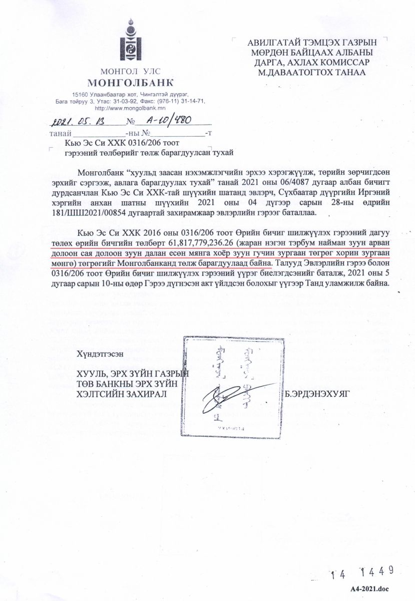 Мөрдөгчийн мэдэгдэл, шаардлагын дагуу Монголбанкны талаас гэрээг цуцалж “Кью Эс Си” ХХК-иас үндсэн болон хүүгийн төлбөрийг төлүүлэх замаар төрд учирсан хохирлыг нөхөн төлүүлэх ажиллагааг явуулж эхэлсэн. Төрийн байгууллагуудын хамтын ажиллагааны үр дүнд тус компани 2021 оны 5 дугаар сарын 6-ны өдөр сүүлийн төлбөр болох 61.8 тэрбум төгрөгийг шилжүүлснээр нийт 123.5 тэрбум төгрөгийн хохирол бүрэн төлөгдлөө.
