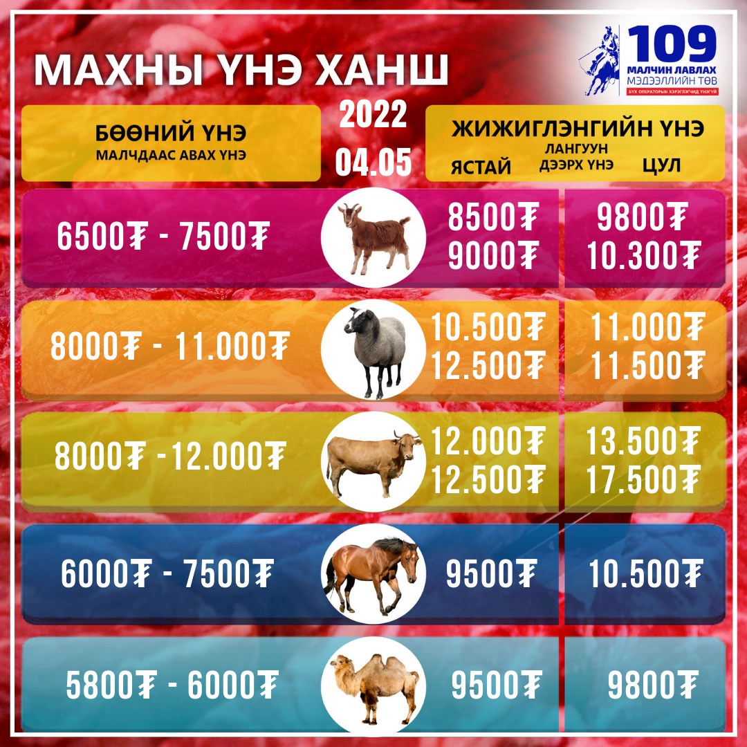2022 оны дөрөвдүгээр сарын 05-ны байдлаар "Малчны лавлах-109" мэдээллийн төвийн мэдээгээр махны жижиглэнгийн үнэ өссөн байна. Үхрийн цул мах килограмм нь 13500-17500 төгрөг, хонь болон ямааны мах 9800-11500 төгрөгийн ханштай байгаа аж. Харин жижиглэнгийн худалдаа болон, хүнсний сүлжээ дэлгүүрүүдэд махны үнэ үүнээс 1000-3000 төгрөгөөр илүү худалдаалж байгаа аж. Нийслэлийн түүхий эдийн зах "Эмээлт"-д ноолуур кг нь 130-165 мянган төгрөгийн үнэ ханштай байгаа аж. Харин ямааны арьс өлөнтэйгөө 30-36 мянган төгрөг, нэхий мөн өлөнтэйгөө 4000 төгрөг, хонины ноос кг нь 1700-1800 төгрөг, үхрийн шир ширхэг нь 5000-6000 мянган төгрөг, бухын шир 12 мянган төгрөг, адууны шир сүүлтэйгээ ширхэг нь 9000 төгрөгийн үнэ ханштай байна.