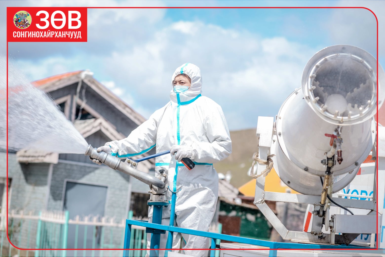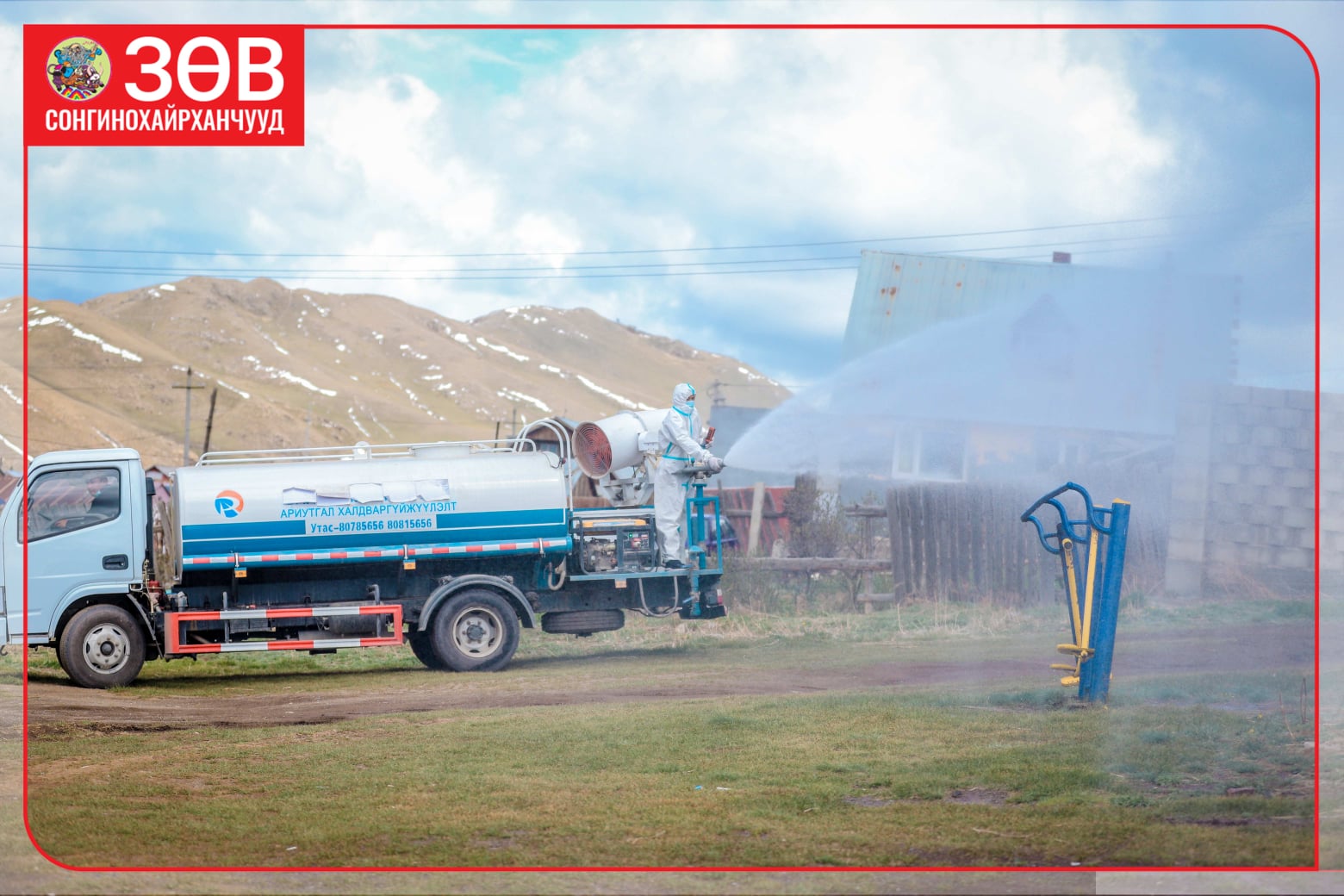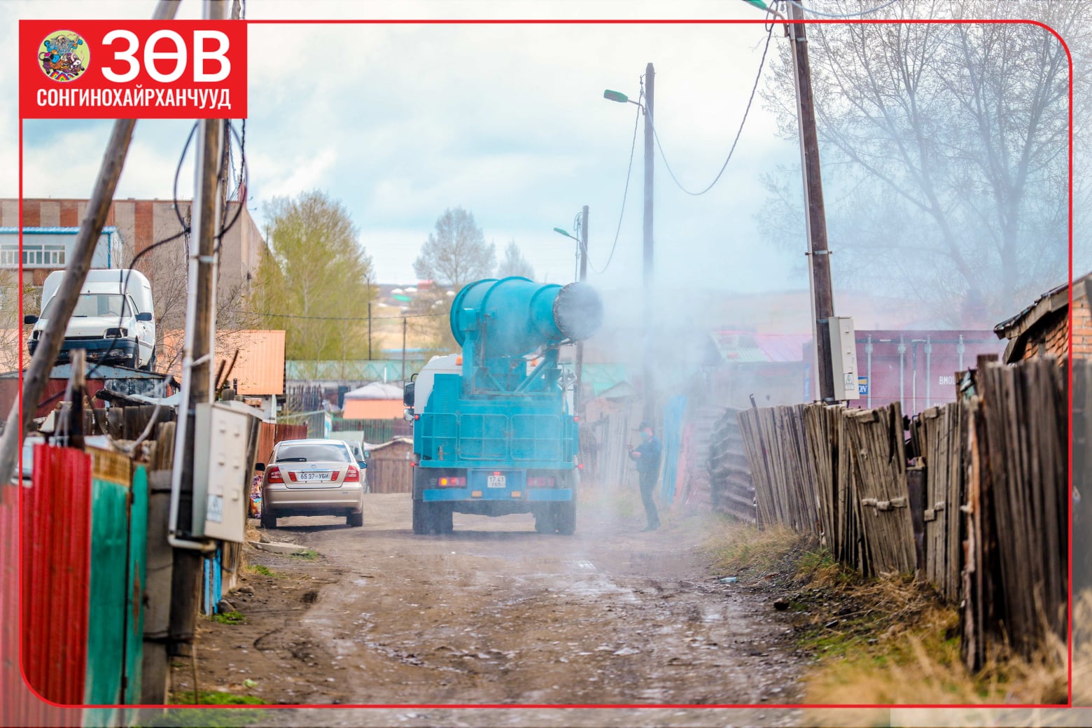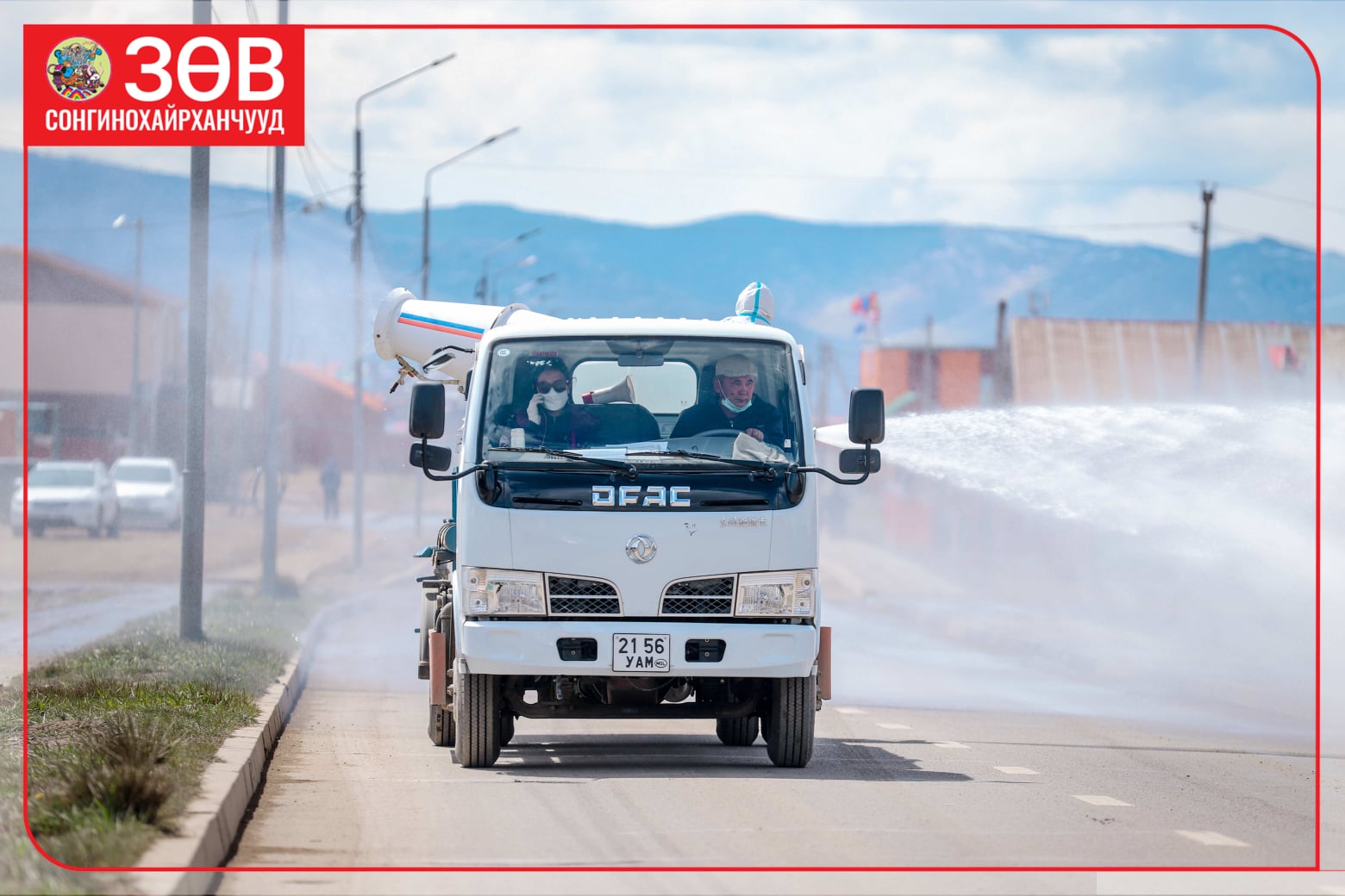 Сонгинохайрхан дүүргийн хэмжээнд “Covid-19” халдвараас урьдчилан сэргийлэх зорилгоор нийтийн эзэмшлийн зам талбайд тусгай зориулалтын мананцар үүсгэгч автомашинаар ариутгал халдваргүйтгэлийн ажлыг зохион байгуулж байна.