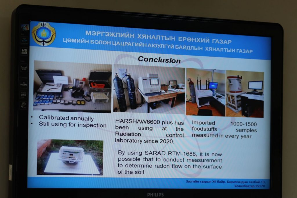 Ажлын хэсэг Мэргэжлийн хяналтын байгууллагад цацрагийн хамгаалалт, аюулгүй байдлын чиглэлээр хэрэгжүүлсэн “Хяналтын болон цацрагийн хамгаалалтын техникийн чадавхийг сайжруулах нь“, “Цацрагийн хамгаалалтын техникийн хүчин чадал болон зохицуулалтыг сайжруулах нь”, “Цацрагийн хяналтын лабораторийн техникийн хүчин чадал болон хүний нөөцийн чадавхийг сайжруулах нь” төслийн үр дүнгийн талаарх мэдээлэл, цацрагийн лабораторийн үйл ажиллагаатай танилцаж үнэлгээ өгөв.