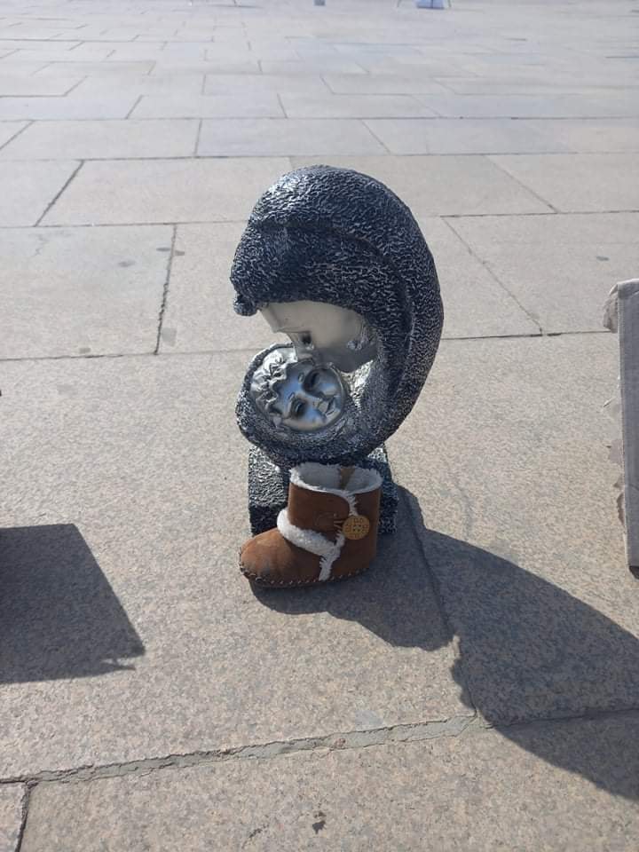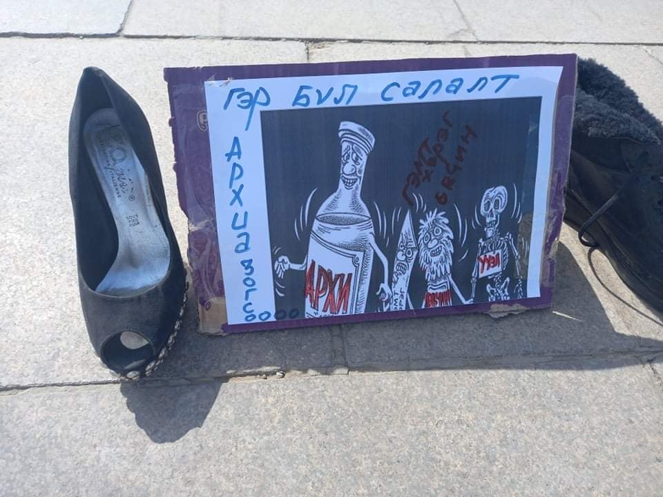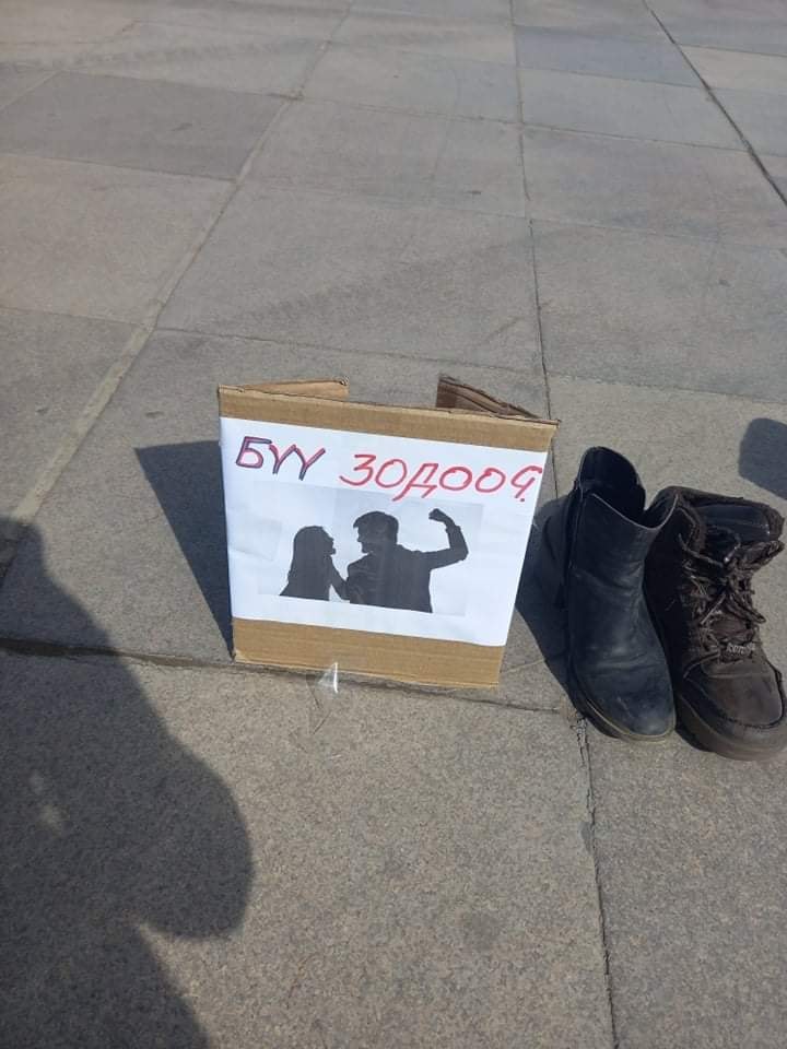 Энэ үеэр эмэгтэйчүүд, ээжүүд, хүүхэд багачууд архидалт, ажилгүйдлээс болж хэрхэн хохирч буй талаар өрөөсөн гутал бүрийхээ хажууд үг бичиж тавьсан байлаа.