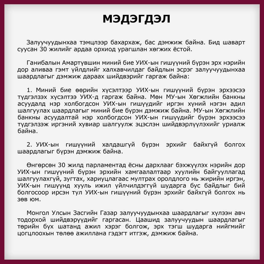 Залуучууд жагсаж, шударга ёсыг тогтоохыг хүсэж, шаардаж эхэлмэгц зарим гишүүд ШУДАРГЫН дүрд гэнэт ТОГЛООД эхэллээ. Энэ дүрийг УИХ-ын гишүүн Г.Амартүвшин эхлүүлэв. Тэрбээр "гэнэт" гишүүний бүрэн эрхээсээ татгалзъя, шалгуулъя гэж ПОПОРЛОО. Сайндаа ч биш Хөгжлийн банкны зээлд холбогдож, эрх мэдэл албан тушаалаа урвуулан ашигласан гэх асуудлаар АТГ-т шалгагдах нөхцөл үүсэж, намаас нь ч шалгуулах, хариуцлага тооцох асуудлыг хөндөөд эхэлсэн. Тэгвэл нэр бүхий гишүүдийн бүрэн эрхийг түдгэлзүүлж, шалгах хүсэлтээ ерөнхий прокурор гаргах гэж байгаа сургаар УИХ-ын гишүүн Г.Амартүвшин их хурлын гишүүний бүрэн эрхээсээ түдгэлзэж, шалгуулахаа мэдэгдлээ.