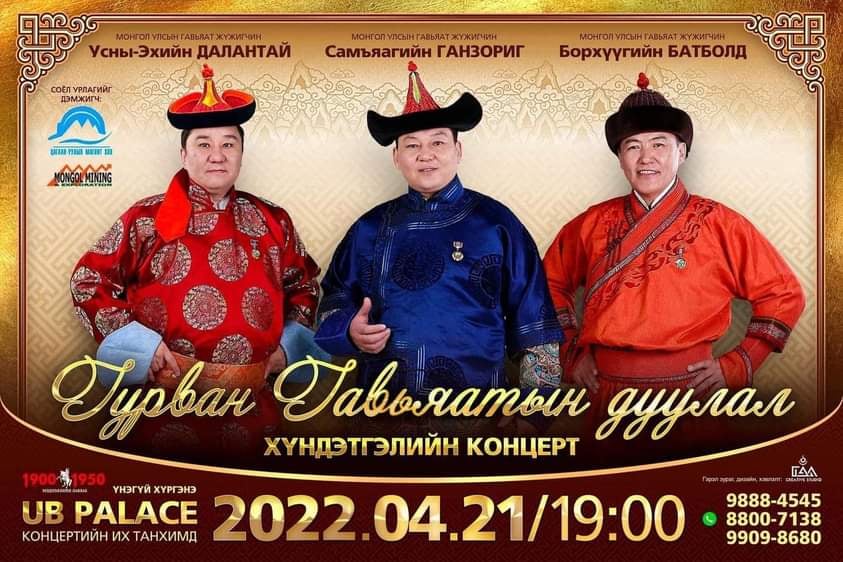 Олон сайхан хит дууг амилуулж, эгшиг аялгуугаар хөглөж ирсэн МУГЖ У.Далантай, С.Ганзориг, Б.Батболд хамтран “Гурван гавьяатын дуулал" хүндэтгэлийн тоглолтоо өргөн барих гэж байна. Тус тусдаа уран бүтээлийн тоглолтыг зохион байгуулж ирсэн дуучид маань АНХ удаагаа хамтарч буй нь энэ юм.