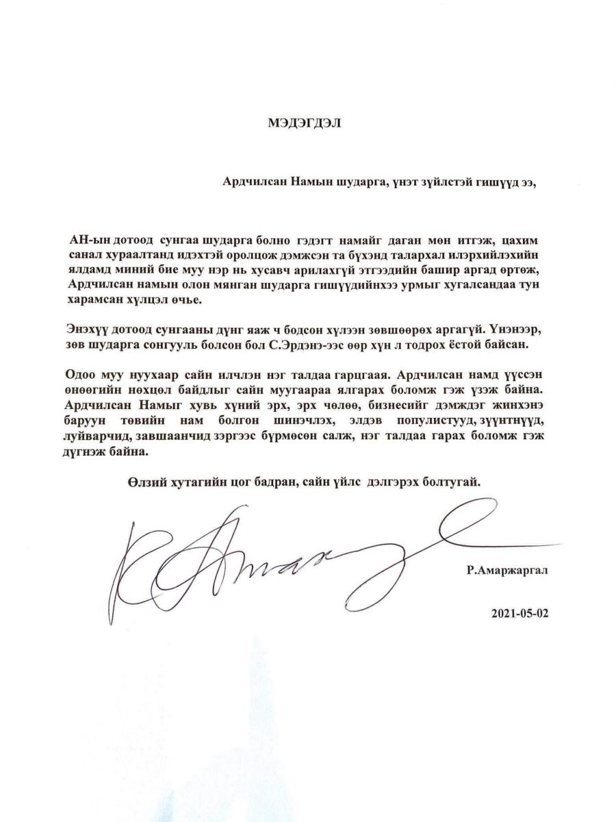 Р.Амаржаргал: АН-ын дотоод сунгаа шударга болно гэдэгт намайг даган мөн итгэж, цахим санал хураалтад идэвхтэй оролцож дэмжсэн та бүхэнд талархал илэрхийлэхийн ялдамд миний бие муу нэр нь хусавч арилгахгүй этгээдийн башир аргад өртөж Ардчилсан намын олон мянган шударга гишүүдийнхээ урмыг хугалсандаа тун харамсан хүлцэл өчье.