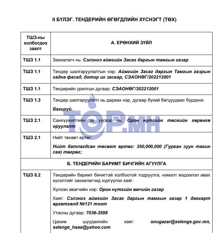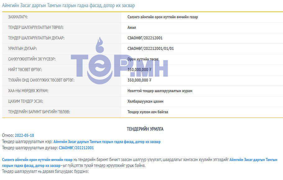 Сэлэнгэ аймгийн засаг даргын тамгын газрын гадна фасад, дотор их засварыг хийхээр 350.000.000 төгрөгийн тендерийг Сэлэнгэ аймгийн Засаг даргын тамгын газраас захиалж, зарлажээ. Тендерийг 5-р сарын 18-нд зарласан бөгөөд 6-р сарын 17-нд хүртэл явуулна.