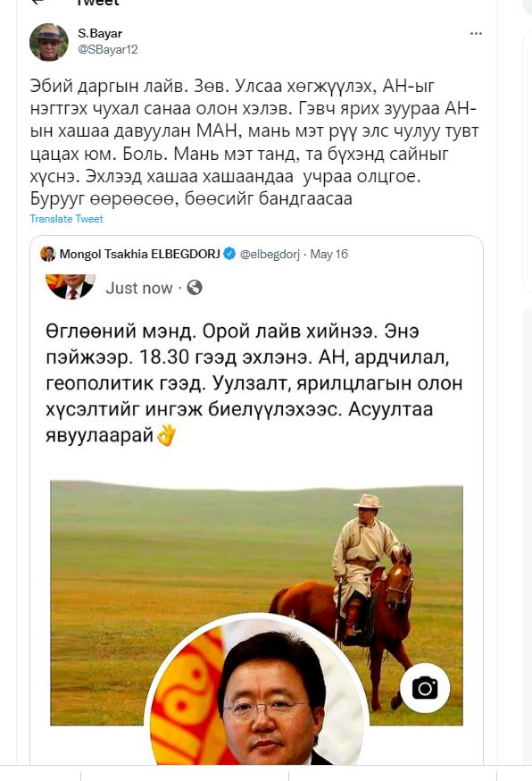 Тэрбээр ийн жиргэжээ. "Эбий даргын лайв. Зөв. Улсаа хөгжүүлэх, АН-ыг нэгтгэх чухал санаа олон хэлэв. Гэвч ярих зуураа АН-ын хашаа давуулан МАН, мань мэт рүү элс чулуу тувт цацах юм. Боль. Мань мэт танд, та бүхэнд сайныг хүснэ. Эхлээд хашаа хашаандаа учраа олцгооё. Бурууг өөрөөсөө, бөөсийг бандгаасаа" гэжээ.