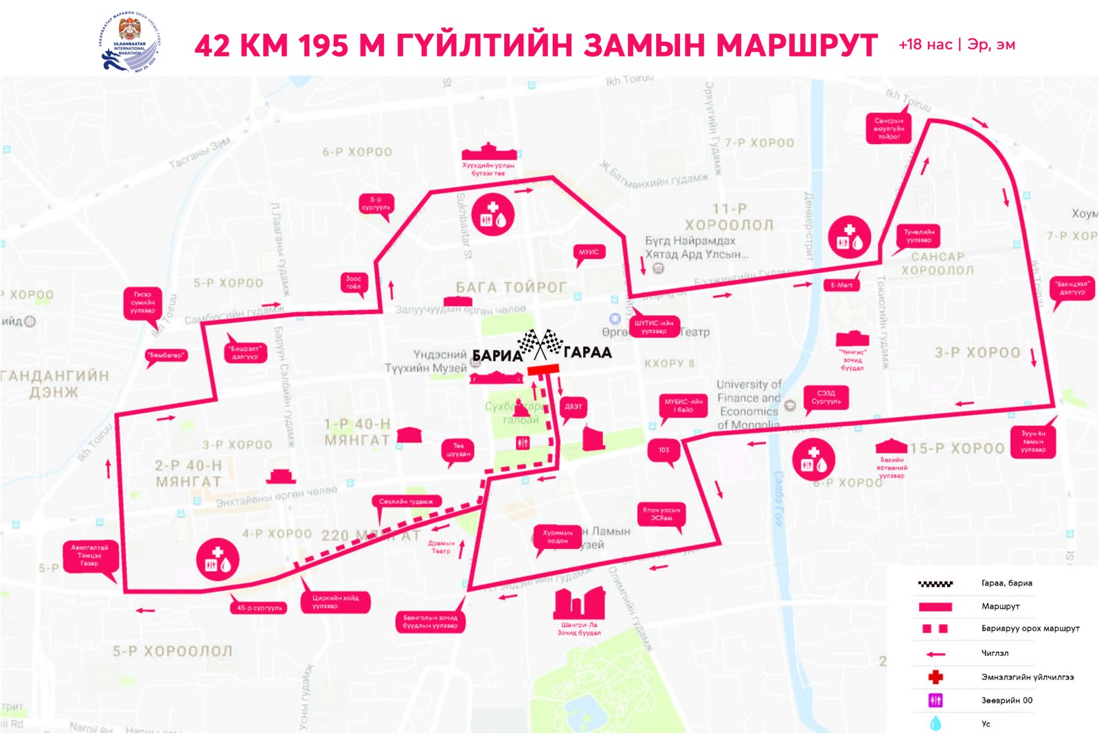 Бүтэн марафон: /ГАРАА/ - Д.Сүхбаатарын талбай-Төв шуудан - Сөүлийн гудамж - "Норе" шүдний эмнэлэг - Бишрэлт дэлгүүр - Зоос гоёл - V сургууль - Хүүхдийн урлан бүтээх төв - МУИС - ШУТИС-ийн уулзвар - Чингис Зочид буудал - Сансарын туннель /Сансарын туслах зам/ - Баянцээл дэлгүүр - Зүүн 4-н замын уулзвар - Бөхийн өргөө - СЭЗДС - МУБИС – 103 - Элчингийн гудамж – Япон улсын ЭСЯ – Шангрила зочид буудал – Баянгол зочид буудлын уулзвал – Драмын театр – Сөүлийн гудамж – /10 км-ийн замыг 4 тойроод барианд орохдоо/ - МУБИС – 103 - Элчингийн гудамж - ДБЭТ – Д.Сүхбаатарын талбай /БАРИА/