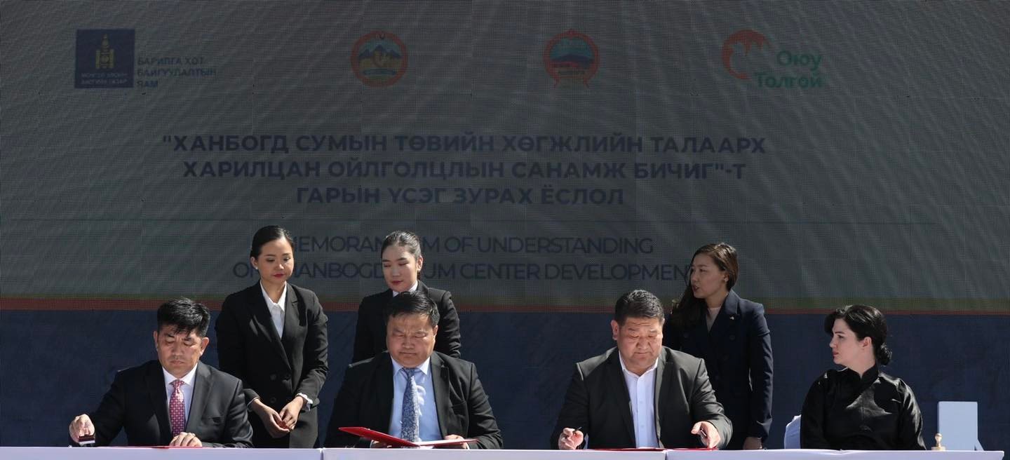 Өмнөговь аймгийн Ханбогд сумын “Ханбогд хөгжлийн ерөнхий төлөвлөгөө-2024” хамтын ажиллагааны санамж бичигт БХБ-ын сайд Б.Мөнхбаатар, "Оюутолгой" ХХК-ийн гүйцэтгэх захирал Дэйрдрэ Лингенфэлдер, Өмнөговь аймгийн Засаг дарга Р.Сэддорж, Ханбогд сумын Засаг дарга Х.Нэхийт нар гарын үсэг зурж баталгаажууллаа.