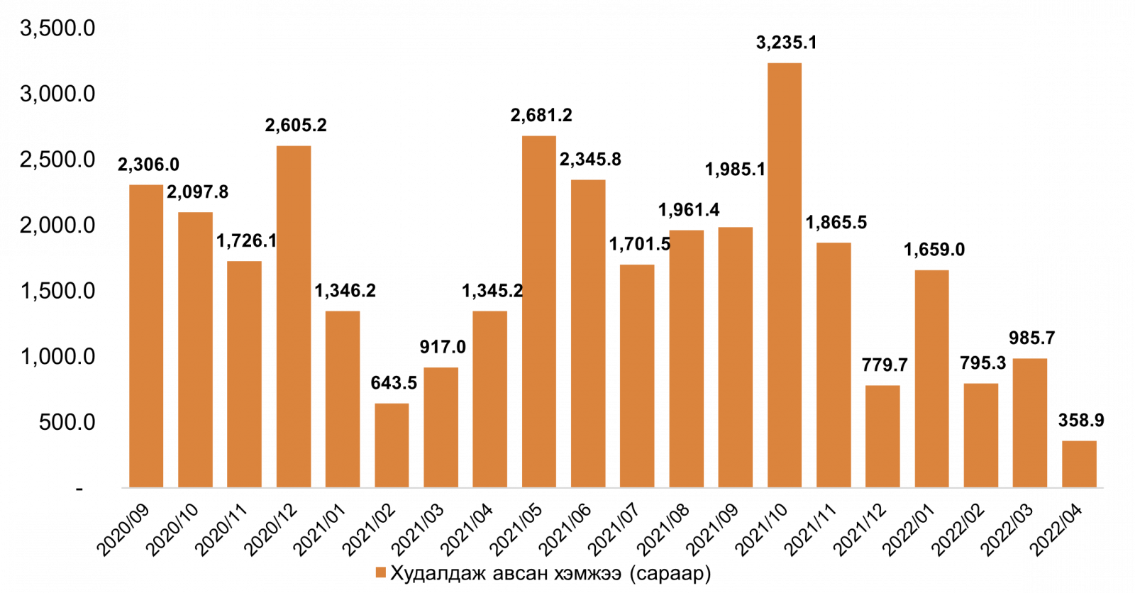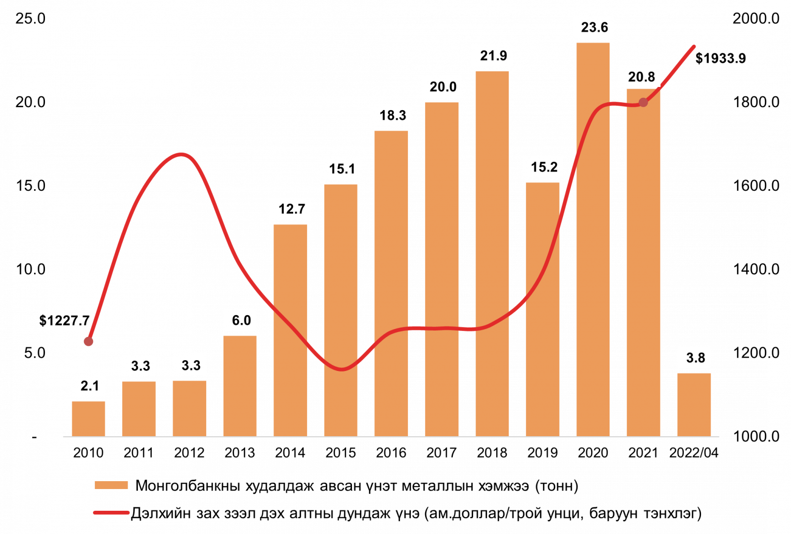 Монголбанк 2022 оны 4 дүгээр сард 358.9 кг үнэт металл худалдан авч, оны эхнээс өссөн дүнгээр нийт 3.8 тн үнэт металл худалдан аваад байна. Энэ нь өмнөх оны мөн үетэй харьцуулбал 453 кг-аар буурсан үзүүлэлт юм. 4 дүгээр сарын хувьд Дархан-Уул аймаг дахь Монголбанкны хэлтэс 2.4 кг, Баянхонгор аймаг дахь Монголбанкны салбар 25.5 кг үнэт металл худалдан авсан.