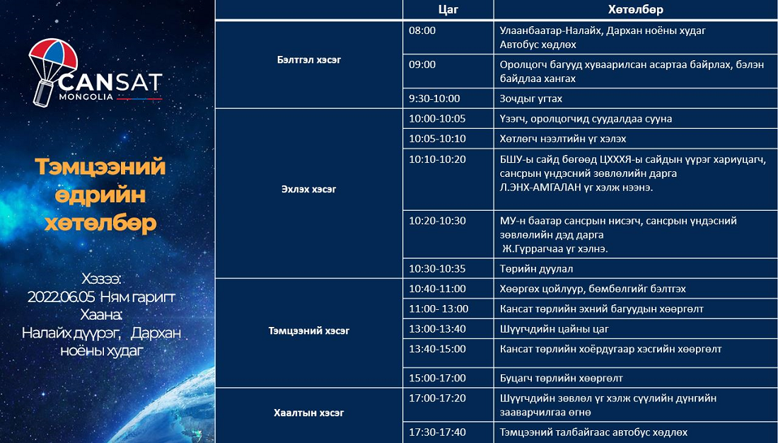 Тус тэмцээнд МУИС, ШУТИС, ХААИС, ҮБХИС, Шинэ Монгол, Монгол Коосэн зэрэг найман их, дээд сургуулийн 15 багийн 90 гаруй оюутан, залуус оролцож, өөрсдийн бүтээсэн сансрын бага оврын хиймэл дагуулыг хөөргөж, өрсөлдөх юм.