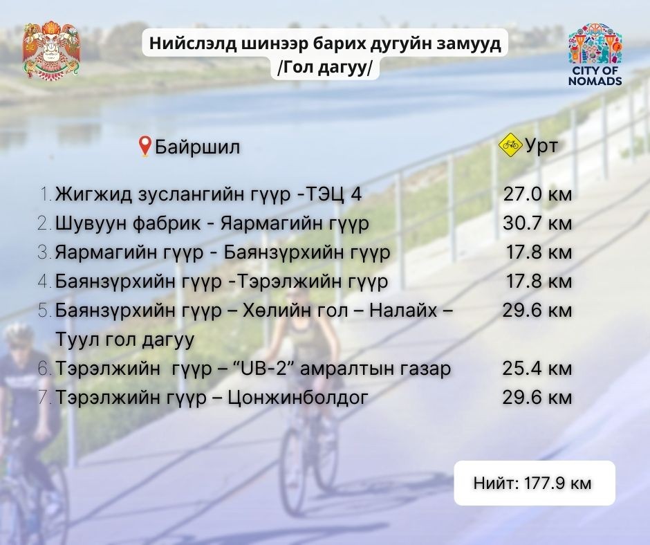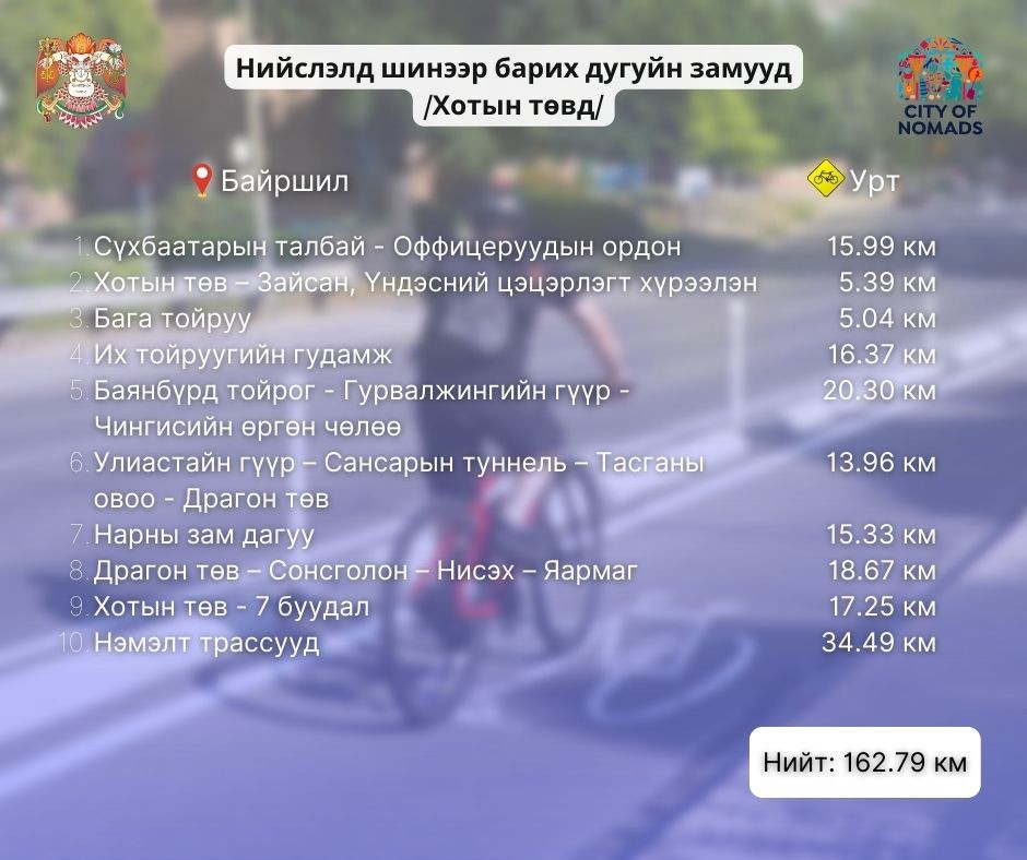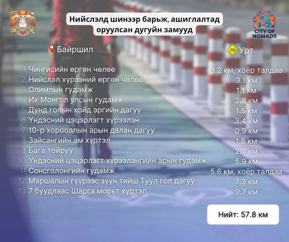 Өнөөдрийн байдлаар нийслэлийн 13 байршилд нийт 57.8 км урт дугуйн зам барьж, ашиглалтад оруулаад байна. Тухайлбал,