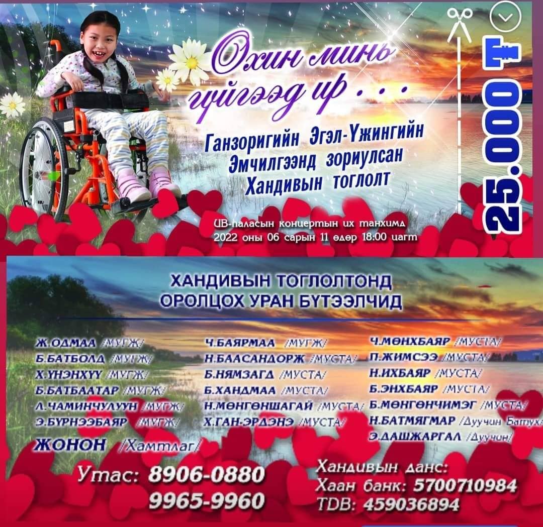 Халуун сэтгэлт Монгол түмнээсээ тусламж хүсэхээс гадна тэд хандивын аяныг ч зохион байгуулж байна. Тиймээс нийтийн дууны сор болсон дуучдын бүтээлийн тоглолтыг үзэж халуун сэтгэлт Монгол түмэн минь хөөрхөн охин Г.Эгэл-Үжингээ хөл дээр нь босгоход туслаач хэмээн нийт МОНГОЛЧУУДААСАА хүсэж байна.