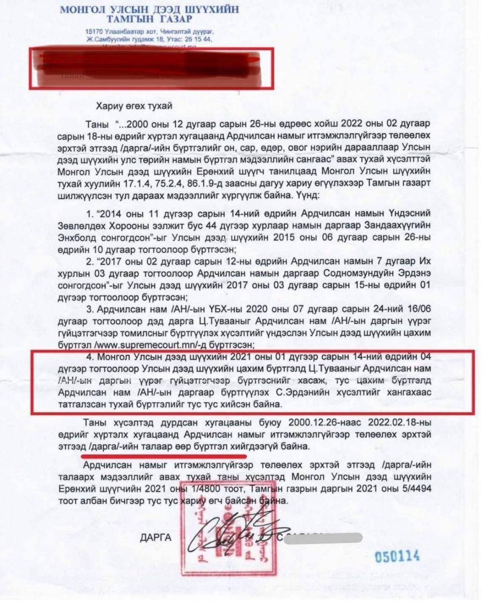 Дээрх татгалзал нь шүүхийн шийдвэр биш бөгөөд хэрэг хянан шийдвэрлэх явцад гарсан шүүгчийн захирамж юм. Энэхүү захирамжид талууд гомдол гаргаж захиргааны хэргийн давж заалдах шатны шүүхээр хэлэлцүүлнэ. Иймд АН-ыг төлөөлөх эрхгүй нь шүүхийн шийдвэрээр олон удаа баталгаажиж, өнөөдрийн шүүгчийн захирамжаар төлөөлөх эрхгүй нь дахин тогтоогдоод байхад АН-ыг төлөөлөх эрхтэй мэт мэдэгдэл хийн, гишүүдийг төөрөгдүүлж байгаа үйлдлээ таслан зогсоохыг С.Эрдэнэ нарын иргэдээс шаардаж байна.