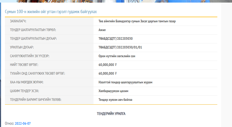 Үүнтэй нэгэн адил өнөөдөр буюу 2022 оны 06-р сарын 07-ны өдөр Төв аймгийн Баяндэлгэр сумын Засаг даргын тамгын газар нэгэн тендер зарлажээ.Тодруулбал, Төв аймгийн Баяндэлгэр сумын Сумын 100-н жилийн ойг угтан 60 сая төгрөгөөр гэрэлт гудамж байгуулахаар төсөвт суулгажээ.