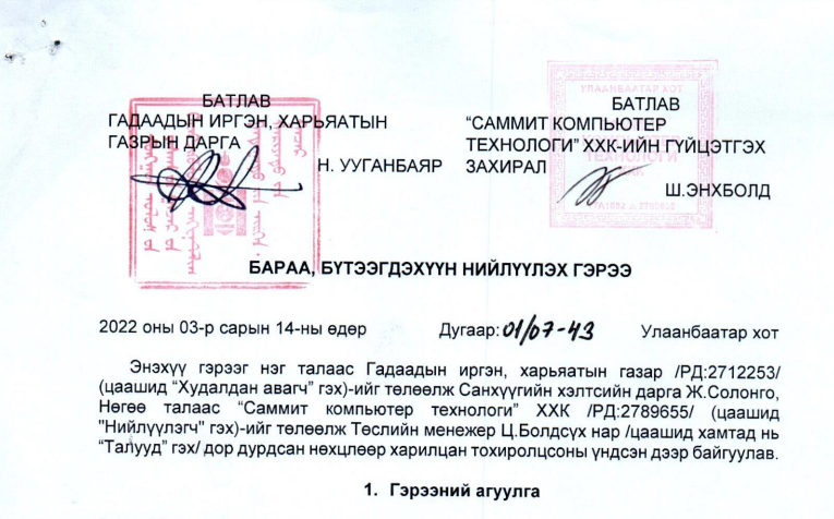 Гадаадын иргэний харъяатын газар нь 2022 оны 3-р сарын 14-ны өдөр Саммит компьютер технологи ХХК-аас 227 сая төгрөгийн компьютер, хэрэгсэл худалдаж авахаар гэрээ байгуулжээ.