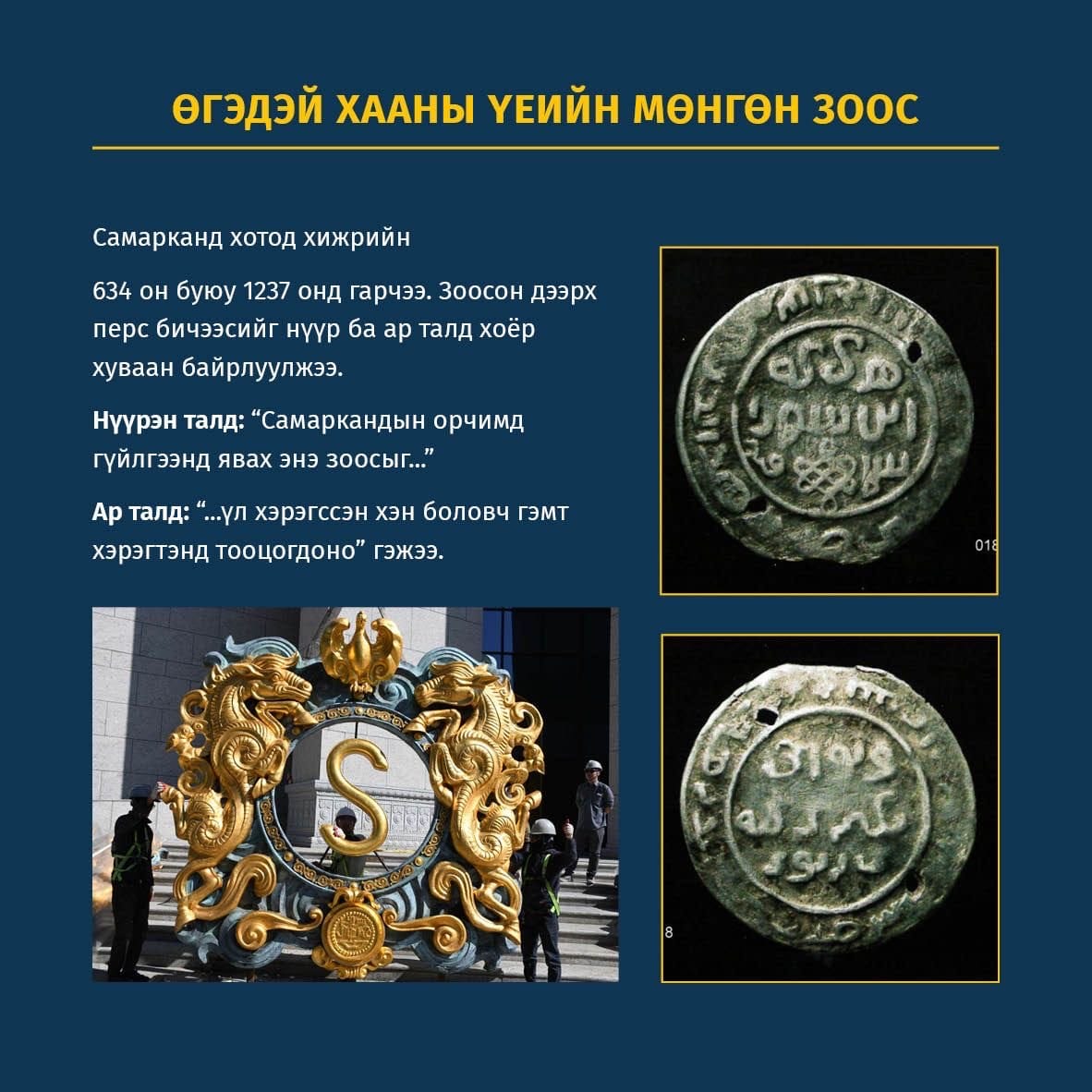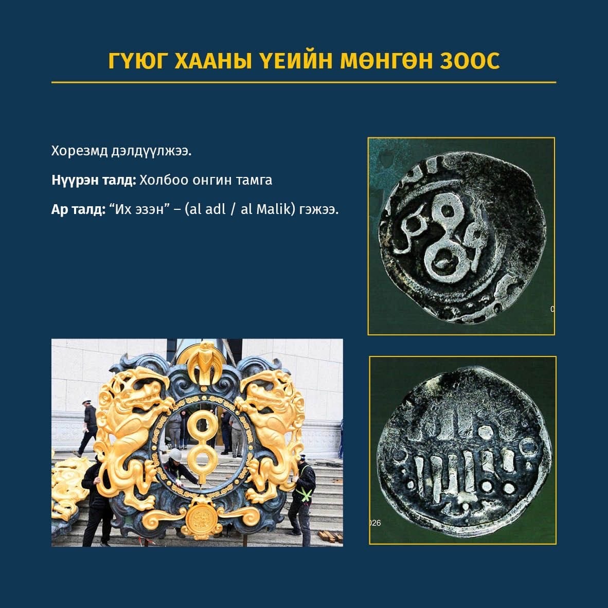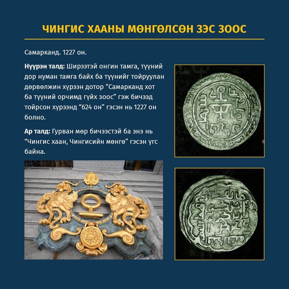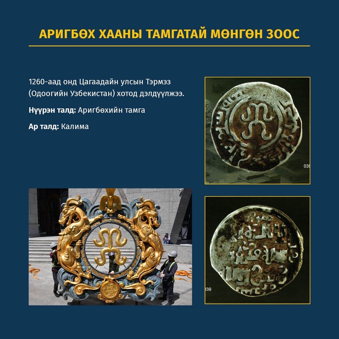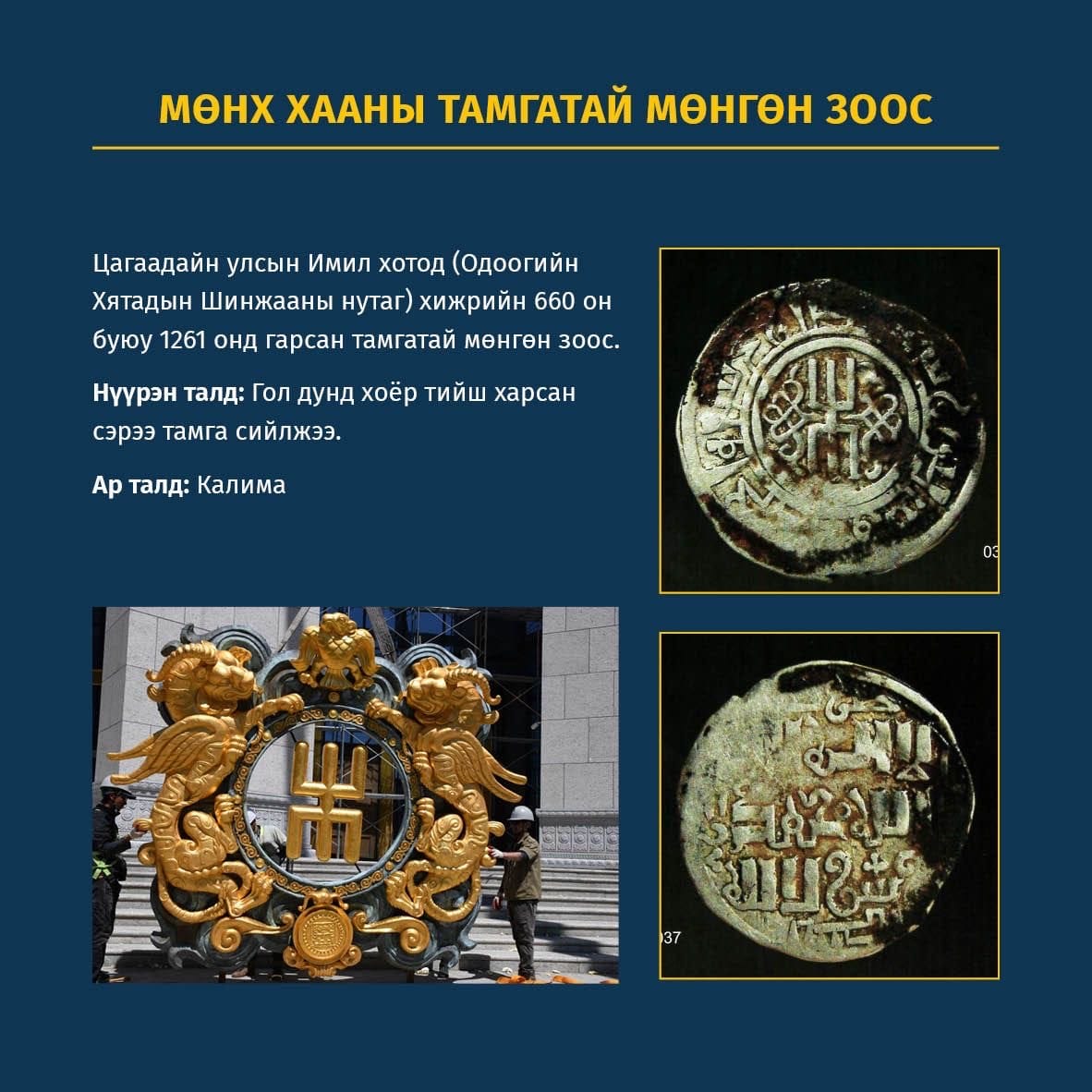 Таван их хааны тамга тус бүрийн дээд талд эртний төрт улсуудын сүлд шүтээн шонхор, галт шувуу зэргийг дүрсэлсэн бол тамганы доод талд тухайн хааны үед хэрэглэж байсан зоосон мөнгийг урлажээ. Их хаадын дэлдүүлсэн эдгээр зоосон дээр тухайн хааны нэр, тамгыг дүрсэлсэн байдаг.
