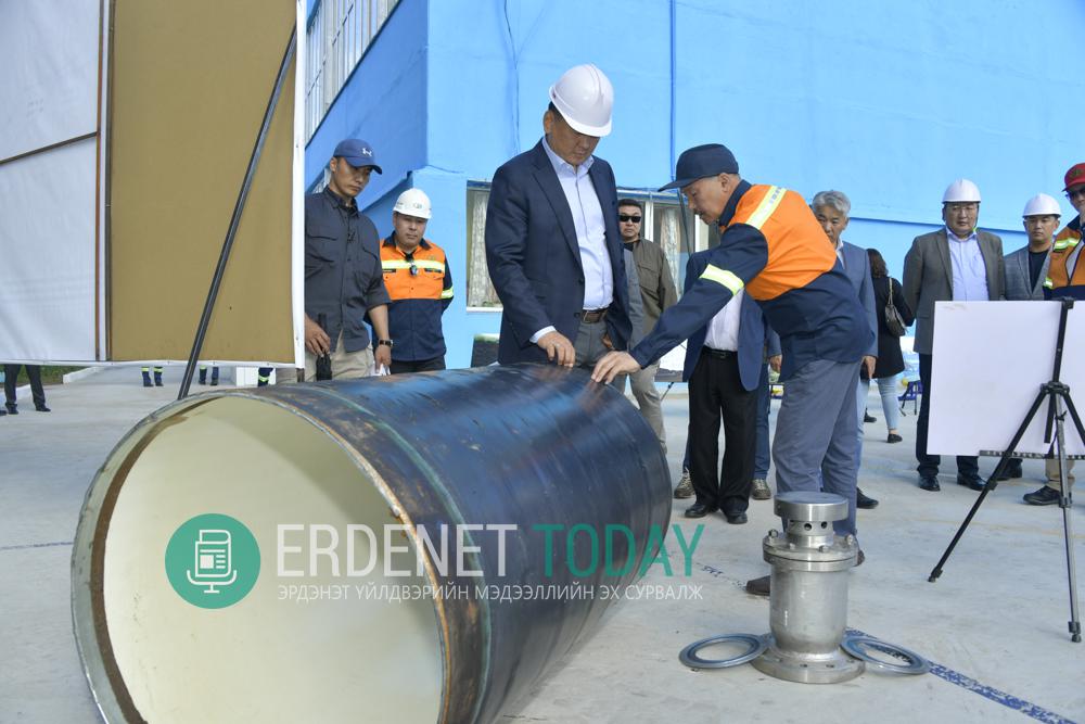 Эрдэнэт үйлдвэрийн хүчин чадал нэмэгдэж, эрдэнэсийн хот өргөжин тэлэхийн хэрээр цэвэр усны хэрэглээ жилээс жилд нэмэгдсээр байна. “Эрдэнэт үйлдвэр” ТӨҮГ ирээдүйн их усны хэрэглээг бүрэн хангахын тулд усан хангамжийн төв 3-р шугам хоолой шинээр тавих түүхэн бүтээн байгуулалтыг цах тахлын амаргүй цаг үед 2 жилийн өмнөөс эхлүүлсэн. Ус хангамжийн цехийн цэвэр ус дамжуулах 3-р шугам 820мм голчтой ган хоолой татах шугам хоолойн угсралтын ажлын хүрээнд нийт 59 мянга гаруй шугам хоолойг худгуудын хаалт арматур дагалдах тоноглолуудын хамт 100 хувь угсарч дуусгасан байна. Мөн улсын комисст хүлээлгэн өгөхөөр бэлтгэл ханган ажиллаж байгааг Ерөнхийлөгчид танилцууллаа.