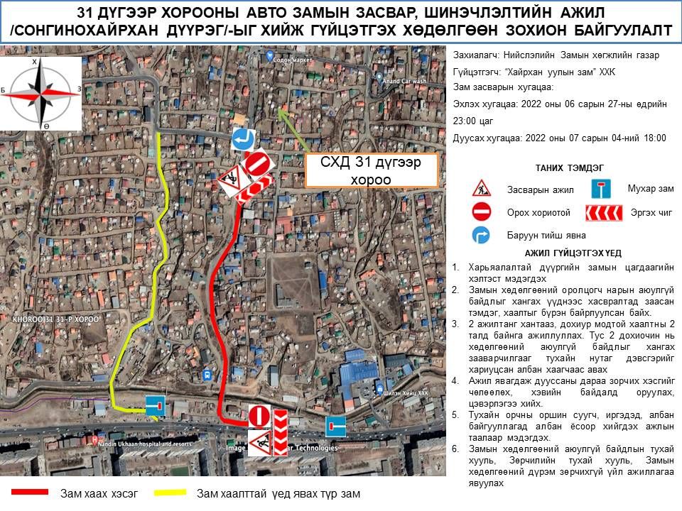 Тус замд 2010 онд их засвар хийснээс хойш ээлжит засвар хийгээгүй. Бүтцийн эвдрэлд орсон учир нэн тэргүүнд шинэчлэх шаардлагатай байгаа юм. Зам засварын ажлын хүрээнд авто замын суурь солих, хашлага суурилуулах, асфальт бетон хучилт, явган замын ажил хийнэ. Иймд иргэд жолооч та бүхэн бусад замыг сонгон хөдөлгөөнд оролцоно уу.