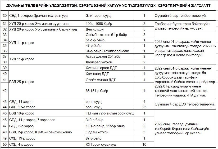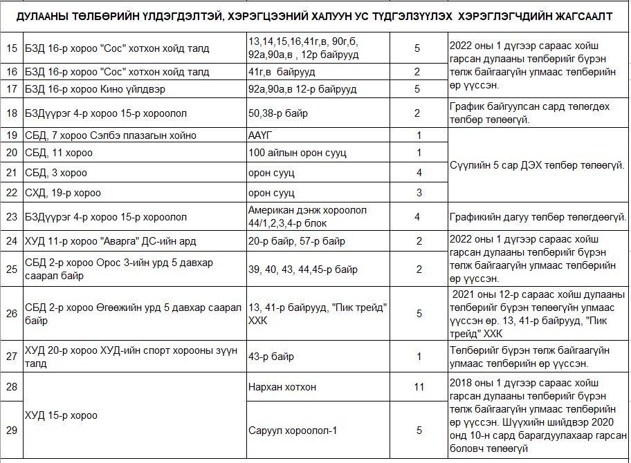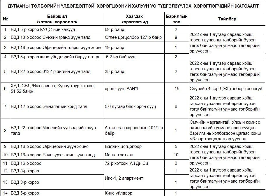 “УБДС” ТӨХК нь дулааны эрчим хүчний төлбөрөө төлөөгүй хэрэглэгчдийн хэрэглээний халуун усыг төлбөрөө төлөх хүртэл хугацаанд хязгаарлахаар болж байгаа бөгөөд хязгаарлагдах хэрэглэгчийн талаарх дэлгэрэнгүй мэдээллийг өөрийн цахим хуудаснуудад мэдээлэх болно" гэжээ. Үүнд: