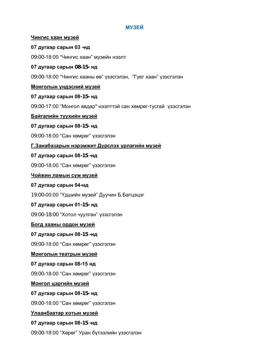 Мөн есөн музей долдугаар сарын 15-ныг хүртэл ажиллах юм байна. Эдгээрээс онцолбол шинээр ашиглалтад орж буй Чингис хаан музейд хаадын үзэсгэлэнгүүд нээгдэх аж.