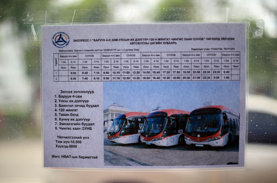 Нэгдүгээр маршрут: Баруун 4 замаас өглөө 05:00, 06:00,10:10, өдөр 11:10, 15:40,16:40, орой 20:50, 21:50 цагуудаас