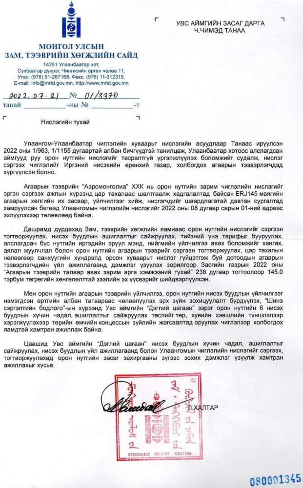 Улаангом-Улаанбаатар чиглэлийн хуваарьт нислэгийг ирэх сарын 1-нээс буюуөнөөдөр эхлүүлнэ. Тухайлбал, "Аэромонголиа" авиа компани орон нутгийн чиглэлийн нислэгийг эргэн сэргээх хүсэлтээ холбогдох яаманд хүргүүлсэн байна.