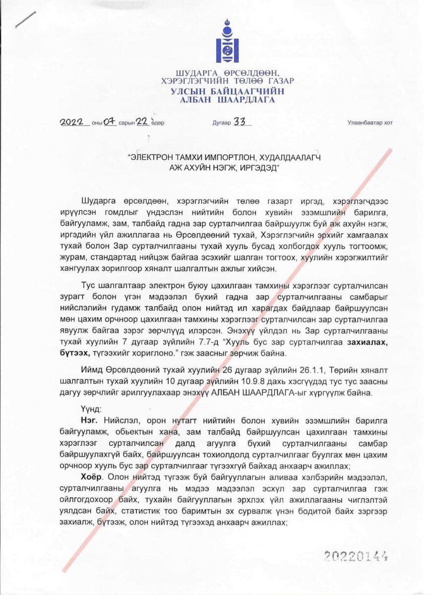 Энэ үйлдэл нь Зар сурталчилгааны тухай хуулийн 7 дугаар зүйлийн 7.7-д “Хууль бус зар сурталчилгаа захиалах, бүтээх, түгээхийг хориглоно” гэж заасныг зөрчиж буй тул зөрчлийг арилгуулахаар “Тамхигүй маргаашийн төлөө” ТББ, “Электрон гаджет”, “Танко трейд”, “Грийн сөркл”, “Новака интернэйшнл”, “Фоор сийсон” ХХК болон цахим орчноор сурталчилгаа хийж буй бусад аж ахуй эрхлэгч, иргэнд улсын байцаагчийн албан шаардлага хүргүүллээ.