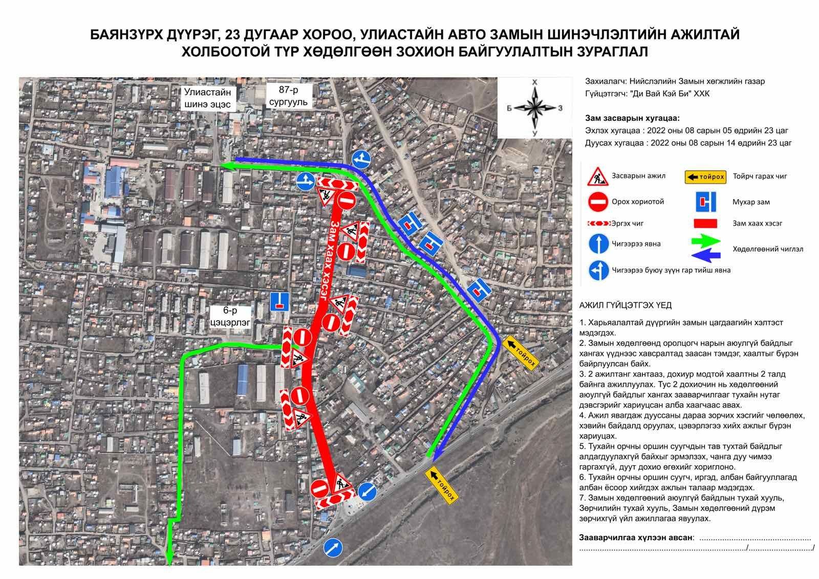 Гачууртын авто замаас Шархадны автобусны эцсийн зогсоол хүртэлх 4.27 км авто замын ажлын хүрээнд 2022 оны наймдугаар сарын 5-ны өдрийн 23:00 цагаас наймдугаар сарын 14-ний өдрийн 23:00 цаг хүртэл Гачууртын авто замаас Улиастайн хуучин эцэс хүртэлх авто замын хөдөлгөөнийг хязгаарлаж асфальтбетон хучилтын ажил хийгдэнэ.