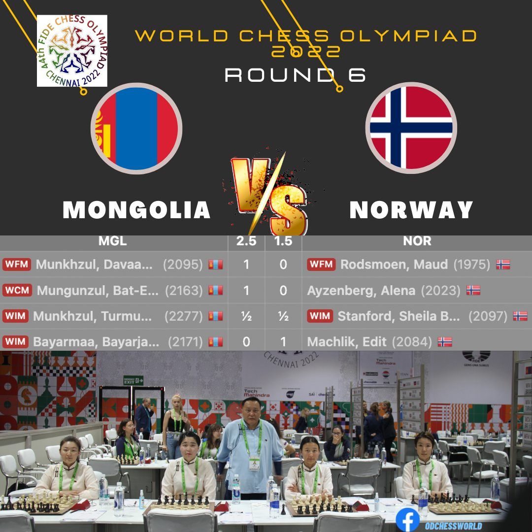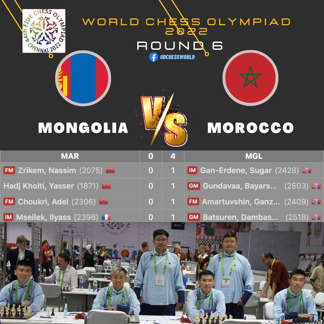 Манай улсын эрэгтэй шигшээ баг олимпиадын чансааны 75 дугаарт бичигдсэн Африк тивийн төлөөлөл Мароккогийн шигшээ багтай оноолт таарч 4:0 харьцаагаар хожлоо. Зургаадугаар өргийн тоглолтыг их мастер С.Билгүүн өнжсөн. Монголын эрэгтэй баг гурван хожил, хоёр тэнцэл, нэг хожигдол гэсэн үр дүнгээр нийт найман оноотой 38 дугаар байрт жагсаж байна.