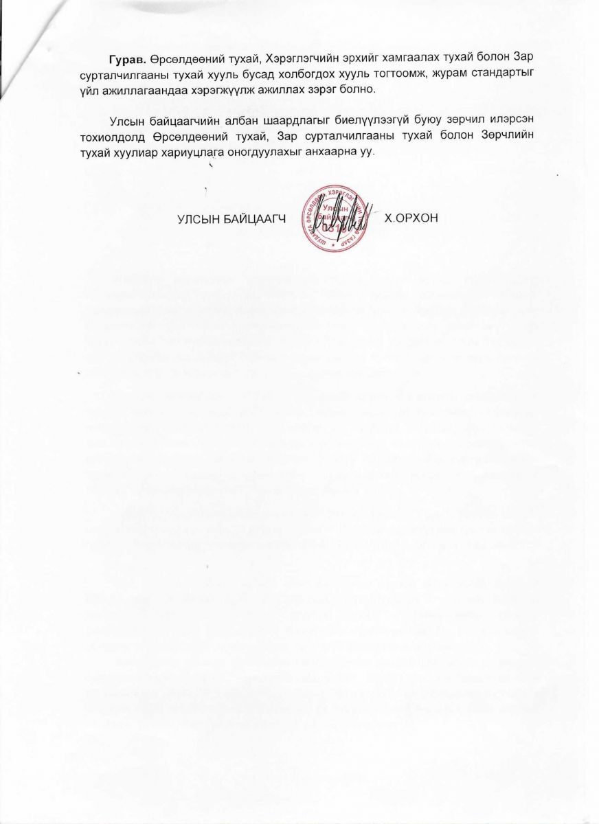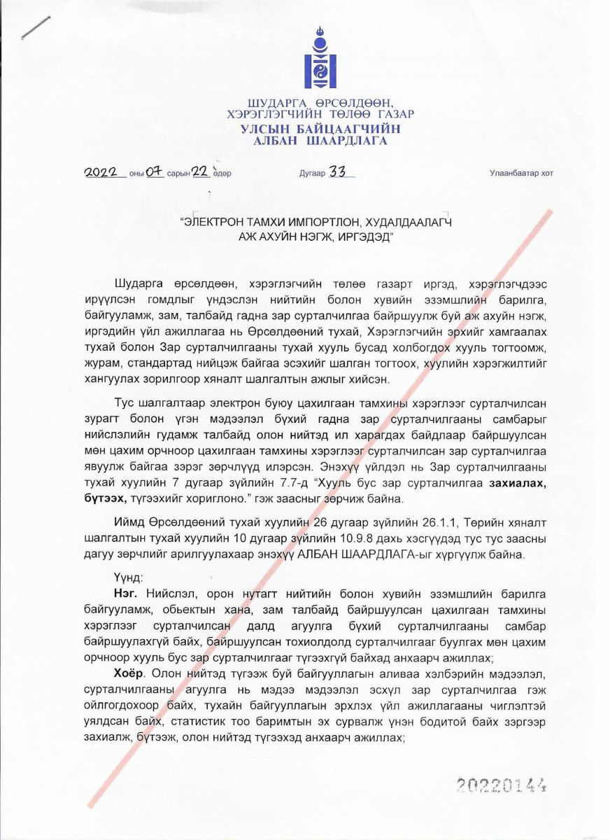 Энэ үйлдэл нь Зар сурталчилгааны тухай хуулийн 7 дугаар зүйлийн 7.7-д “Хууль бус зар сурталчилгаа захиалах, бүтээх, түгээхийг хориглоно” гэж заасныг зөрчиж буй тул зөрчлийг арилгуулахаар “Тамхигүй маргаашийн төлөө” ТББ, “Электрон гаджет”, “Танко трейд”, “Грийн сөркл”, “Новака интернэйшнл”, “Фоор сийсон” ХХК болон цахим орчноор сурталчилгаа хийж буй бусад аж ахуй эрхлэгч, иргэнд улсын байцаагчийн албан шаардлага хүргүүллээ.