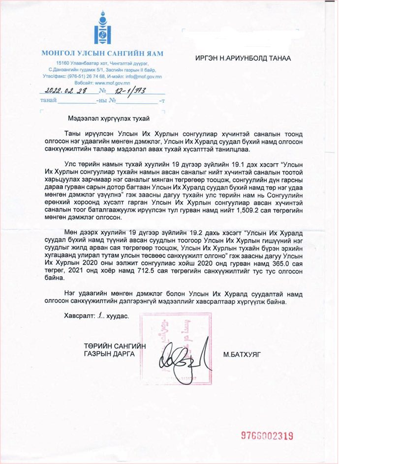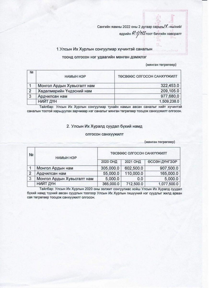 Гэтэл Улсын дээд шүүхийн шийдвэрийг ТӨРИЙН БАЙГУУЛЛАГА нь гүйцэтгэдэггүй байх юм. Энэ хооронд улсаас “Улс төрийн намын тухай хууль”-ийн дагуу УИХ-ын сонгуулиар тухайн намын авсан саналыг үндэслэн Улсын их хуралд суудал бүхий намд олгодог мөнгийг С.Эрдэнэ авч завшсан баримт энд байна. Хуульгүй Монголд 200 мянган АН-ын гишүүдийнхээ сонголтыг луйвардаж, намынхаа мөнгийг халаасалсан энэ үйлдэл АН-ийн энгийн гишүүдийн итгэл рүү ус цацсанаас ч долоон дор.