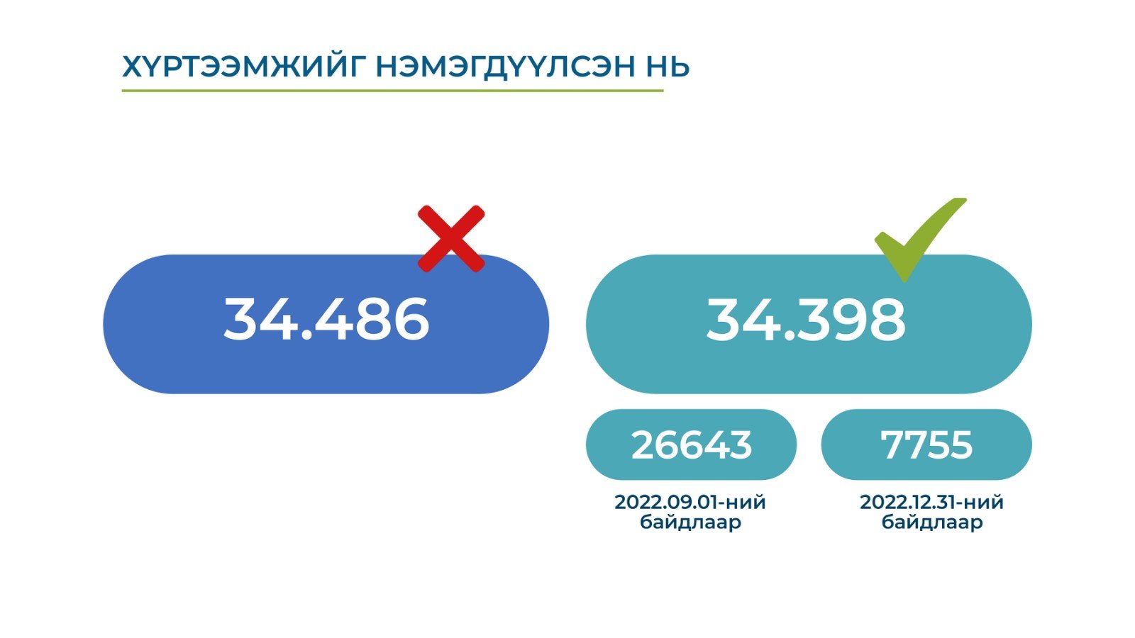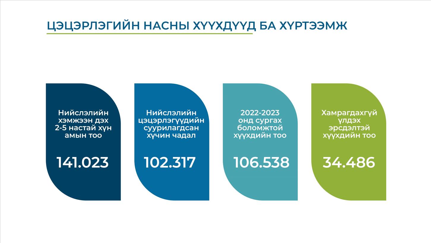 - 2022.12.31 гэхэд -7755 хүүхэд буюун ийт 34398 хүүхдийг цэцэрлэгт хамруулах боломж бүрдүүлээд байна.