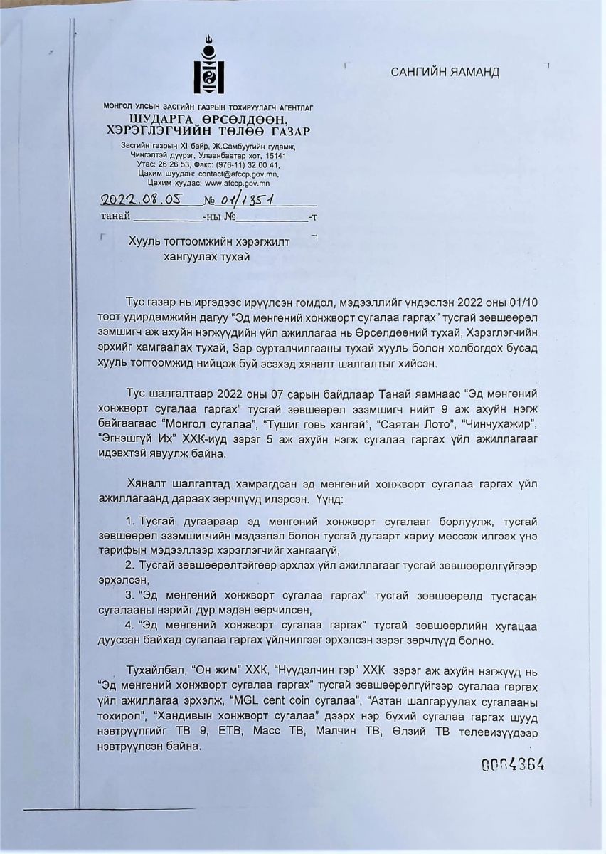 "Саятан Лото” ХХК-ийн зүгээс 1900-0000 тусгай дугаараар “Үндэсний сугалаа” нэртэй сугалааг эрхлэн явуулахдаа тусгай дугаараар эд мөнгөний хонжворт сугалаа явуулсан, хариу мессэж илгээх болон үнэ, тарифын талаар урьдчилан мэдээллээр хангаагүй зэрэг нь Зөрчлийн тухай хуулийн 10.2 дугаар зүйлийн 1.1-д заасныг зөрчсөн байх тул 5 сая төгрөгийн торгууль ногдуулах арга хэмжээ авч ажиллалаа.