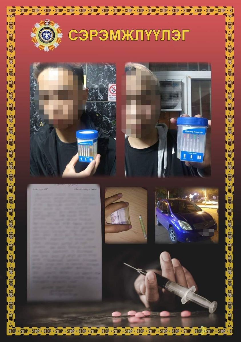 Шөнийн эргүүлийн хэлтсийн алба хаагчид 2022 оны 08 дугаар сарын 16-ний шөнө Чингэлтэй дүүргийн 2-р хороо Барилгачдын талбай орчим эргүүлийн үүрэг гүйцэтгэх үедээ сэжиг бүхий тээврийн хэрэгслийг зогсоон шалгахад 20 орчим насны 2 иргэн хар тамхи, мансууруулах бодис хэрэглэн тээврийн хэрэгсэл жолоодож явсныг таслан зогсоож Чингэлтэй дүүрэг дэх Цагдаагийн нэгдүгээр хэлтэст хүлээлгэн өгсөн байна.